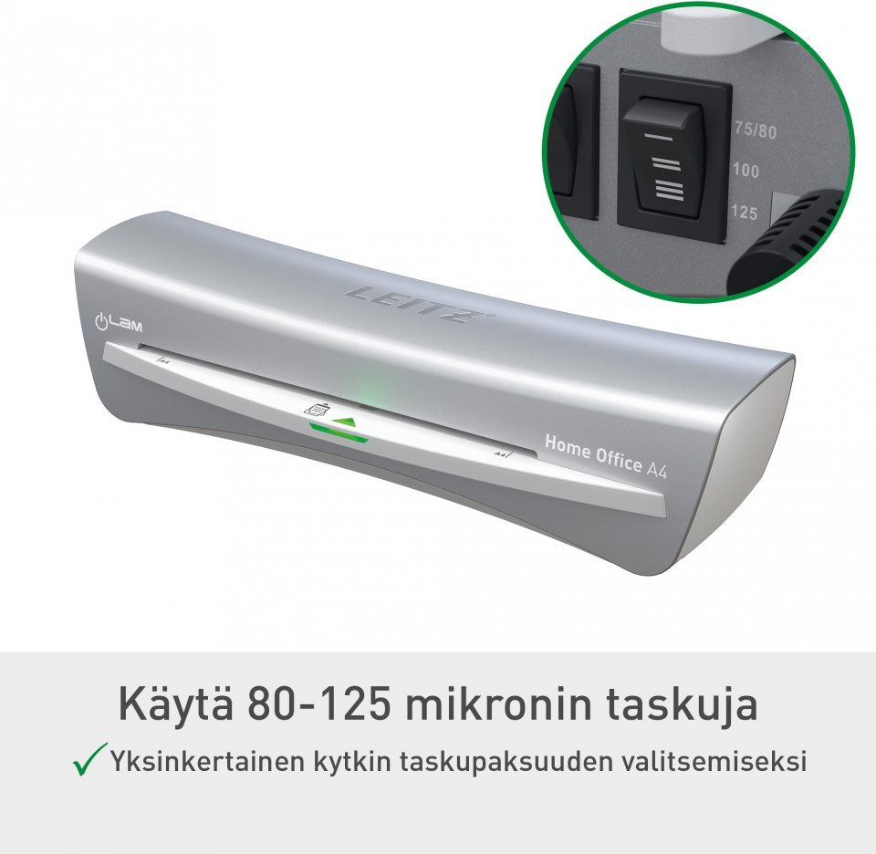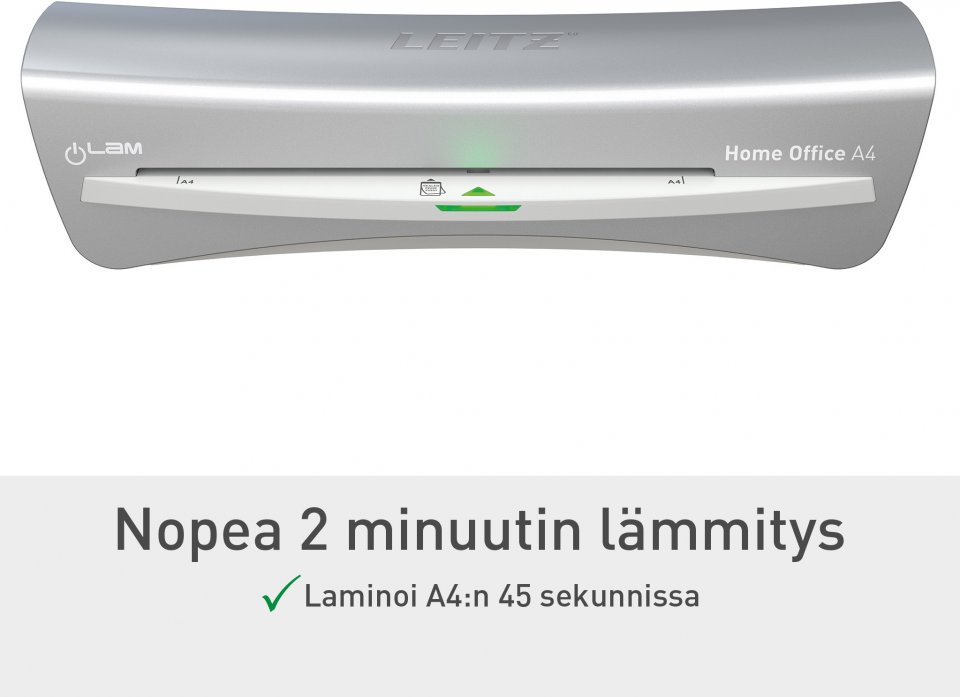 Leitz iLAM Home Office -laminointikone on tyylikäs ja kompakti, ja siinä yhdistyvät saumattomasti moderni design ja toiminnallisuus. Tämä A4-laminointilaite on suunniteltu käteväksi, ja siinä on nopea 2 minuutin lämpenemisaika, ja se laminoi 80 mikronin A4-arkin vain 45 sekunnissa. Käyttäjäystävällisen kytkimen avulla voit valita kolmesta taskupaksuuden tasosta, mikä takaa monipuolisen käytön kaikkiin laminointitarpeisiisi. Jumiutumisenesto vipu takaa sujuvan toiminnan ratkaisemalla vaivattomasti kaikki väärin syötetyt tai juuttuneet taskut. Innovatiiviset SMART LED valot parantavat käyttömukavuutta valojen ja äänien avulla: punainen valo lämpenemisen aikana, vihreä valo äänimerkillä, kun laite on valmis, ja vilkkuva punainen merkkivalo automaattisen sammumisen aikana. Kone sammuu automaattisesti 15 minuutin käyttämättömyyden jälkeen. Suojaa asiakirjasi nopeasti, tehokkaasti ja tyylikkäästi. Hopea ja valkoinen väri.