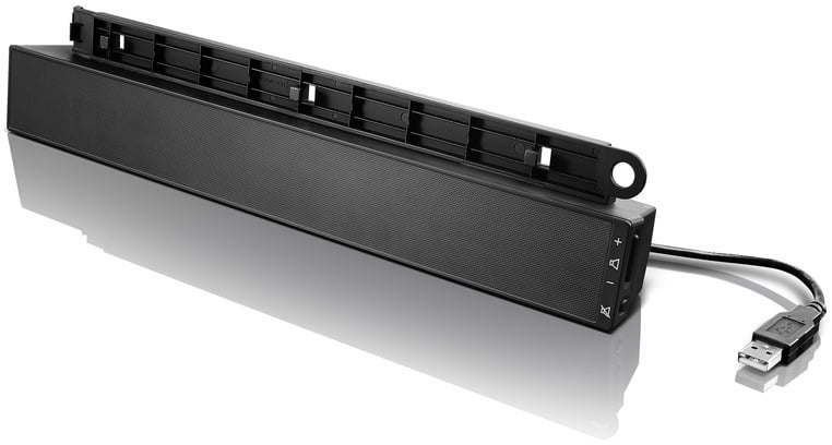 Lenovo USB Soundbar -kaiutin tuo stereoäänet yhteensopiviin ThinkVision-näyttöihin. Näyttöön integroitava kaiutin säästää tilaa pöydältä. Kaksi 1,25 wattista kaiutinta tarjoavat riittävän äänentoiston multimediakäyttöön.