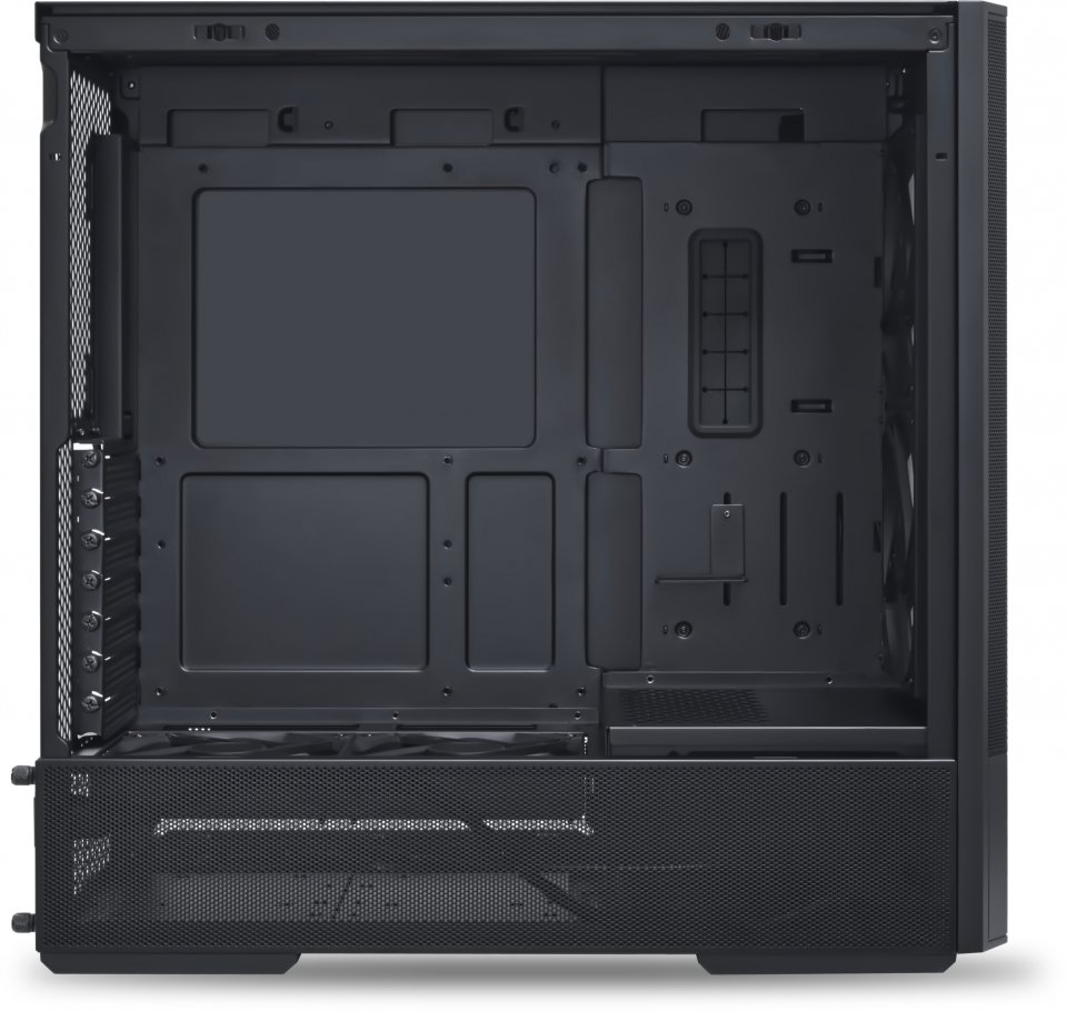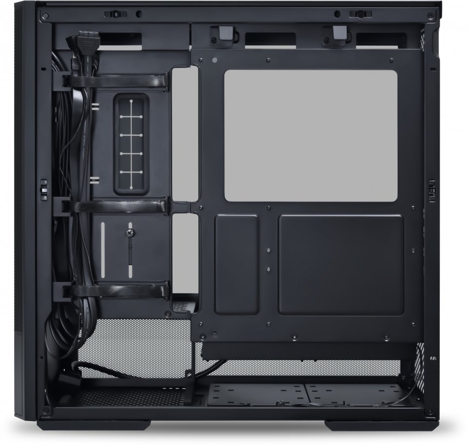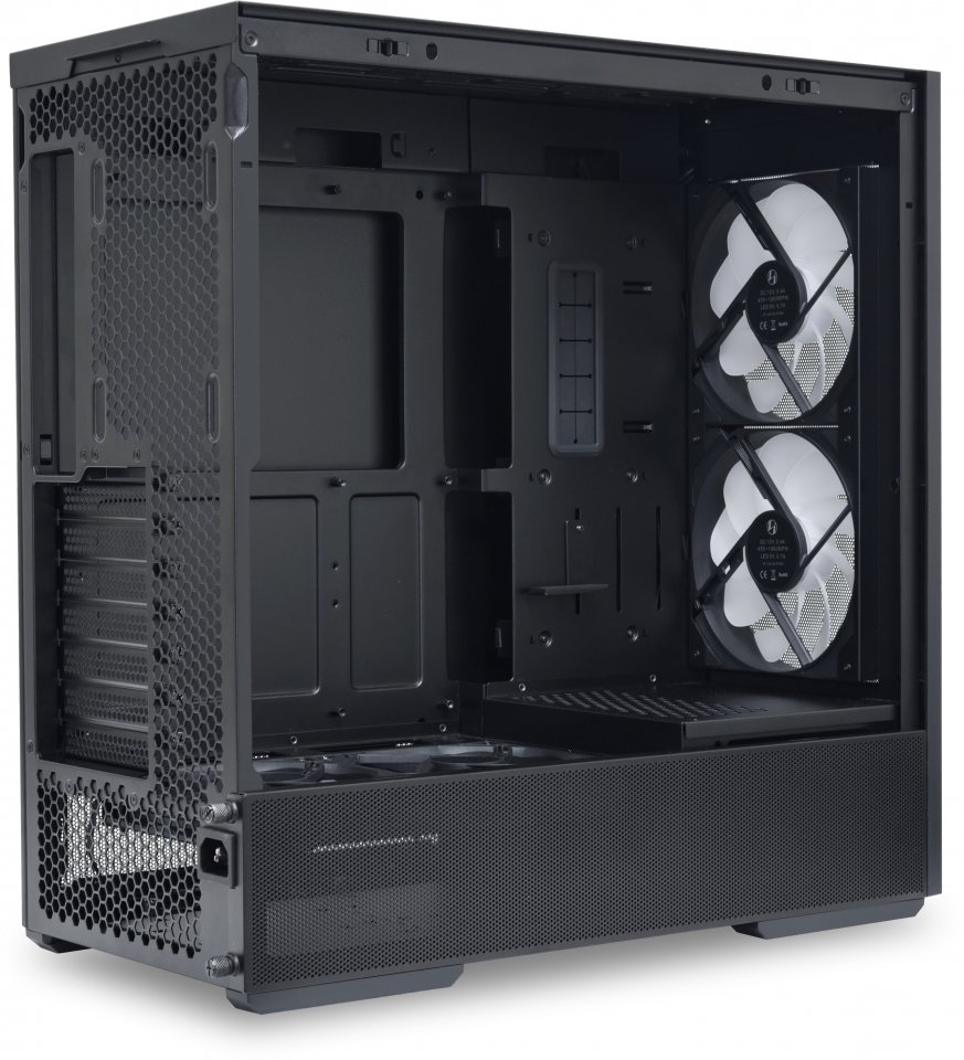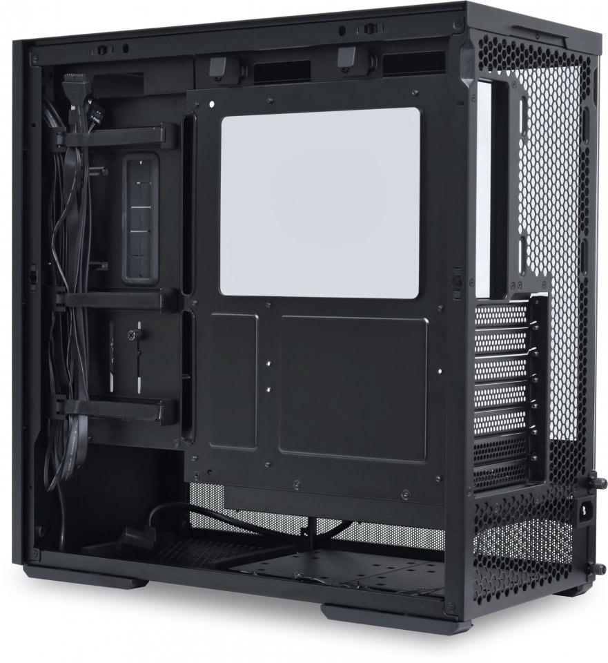 Innovatiivinen sisäinen rakenne helpottaa kaapelien siistiä järjestelyä ja tarjoaa tilaa useille kaapelinhallintavälineille, kuten kolmelle tarranauhakiinnitykselle ja läpivienneille emolevyn kaapeleille.