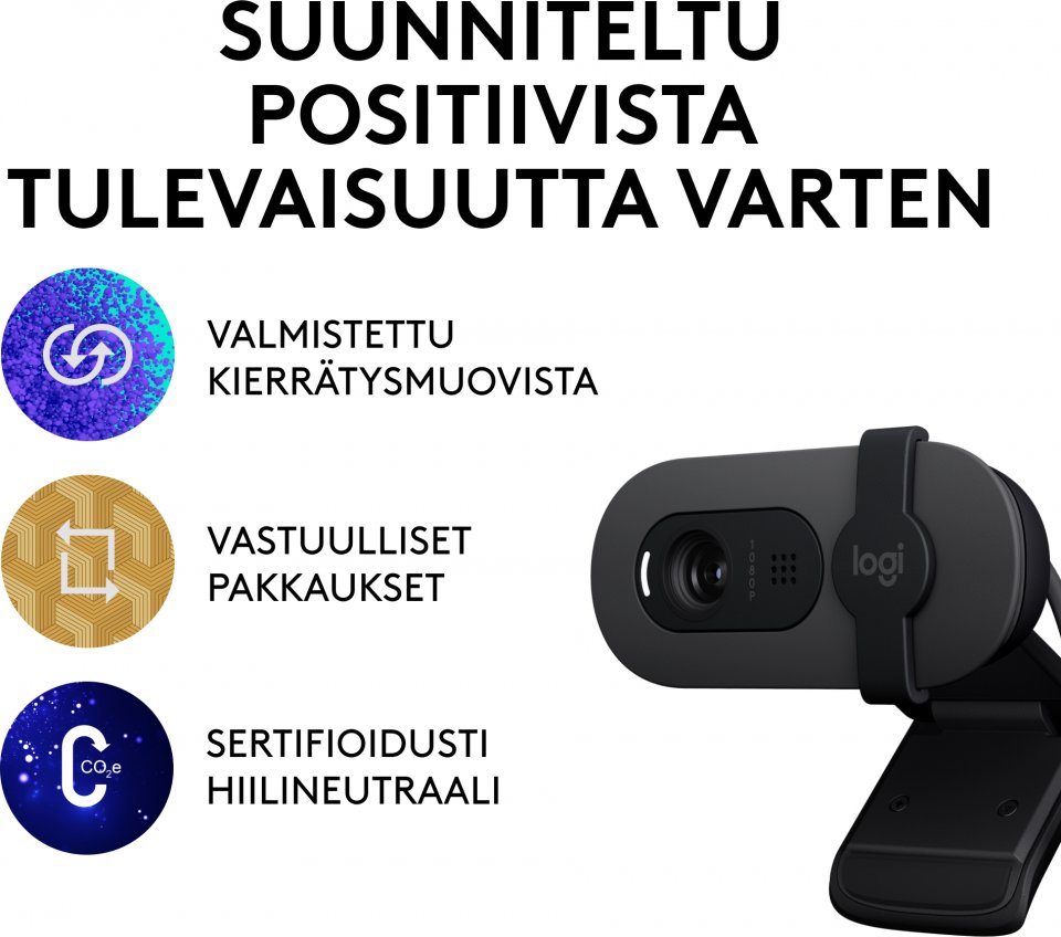 Valmistettu kierrätysmuovista: Brio 100 Full HD -verkkokamera on valmistettu vähintään 34-prosenttisesti kuluttajakäytön jälkeen kierrätetystä muovista.