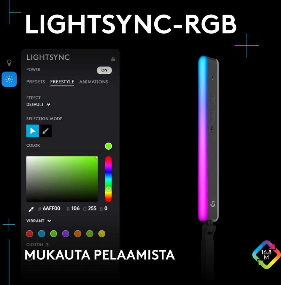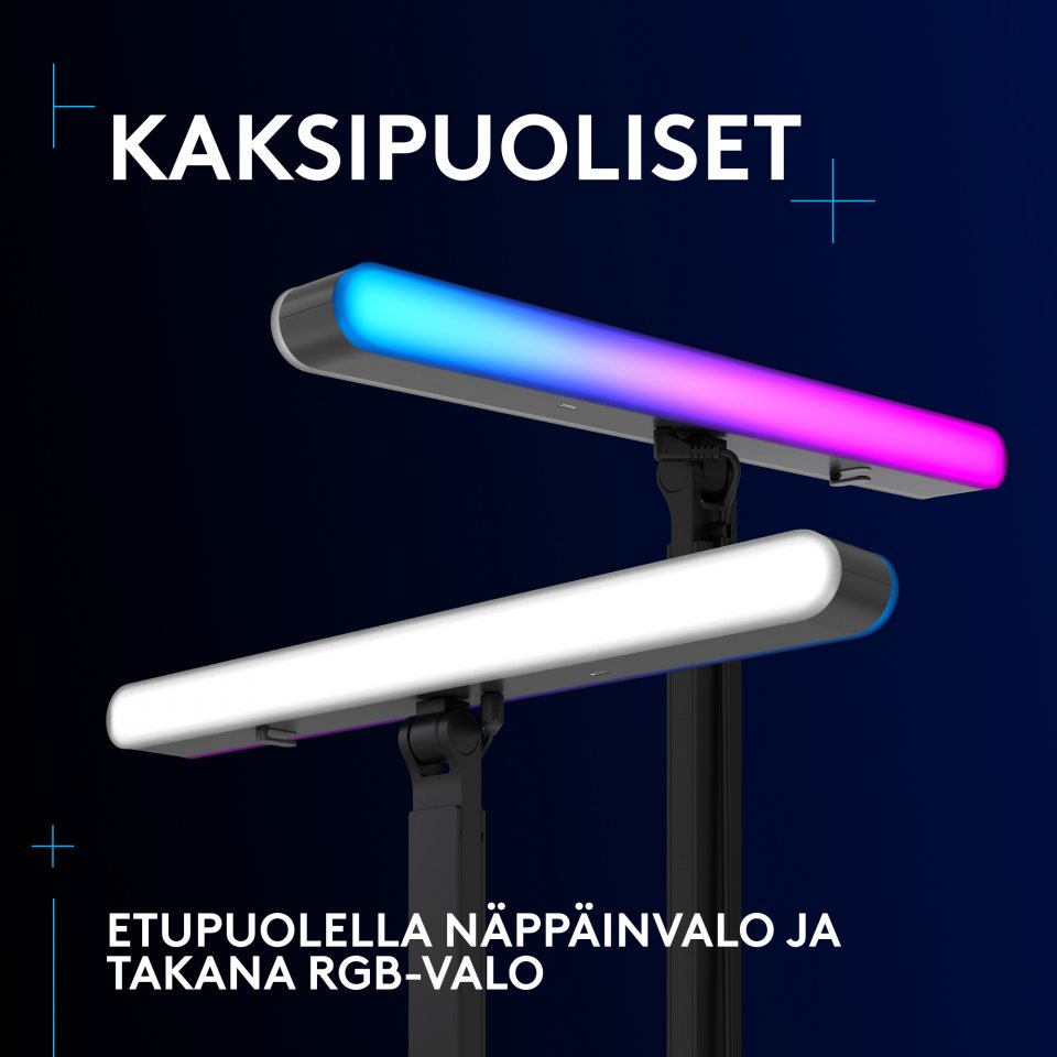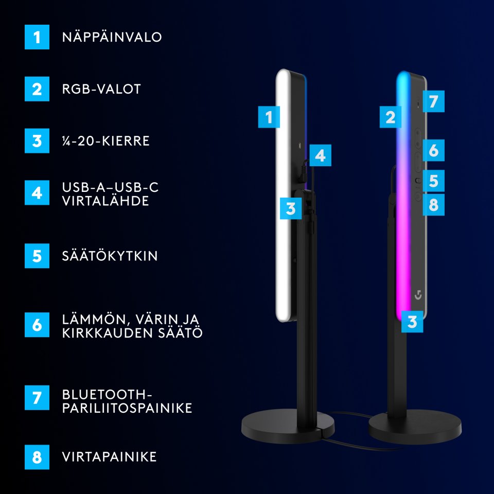 Käytä sisäänrakennettuja säätimiä tai yhdistä Bluetoothilla G HUBiin voidaksesi kokeilla eri säätöjä värille, värilämpötilalle ja kirkkaudelle. Kokeile asetuksia suoralla esikatselulla, ennen kuin aloitat suoratoiston. Synkronoi RGB-puoli LIGHTSYNCillä muihin Logitech G -laitteisiin, kuten hiiriin ja näppäimistöihin. Laita kaikki valot reagoimaan suosikkipeliesi näkymiin tai näyttämään itse ohjelmoimiasi valokuvioita. Litra Beam LX:n kaksilla huippuvaloilla luot mukaansatempaavan peliympäristön.