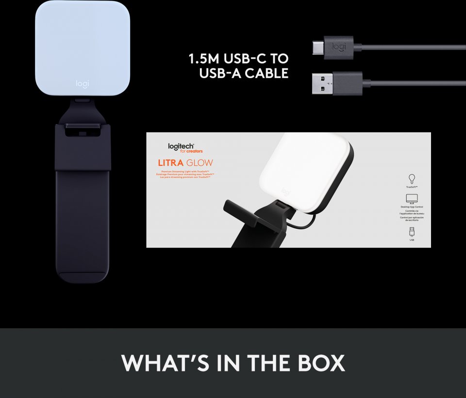 • Myyntipakkauksen sisältö: Litra Glow -valo, näyttöpidike, USB-C - USB-A -johto, käyttäjän dokumentaatio