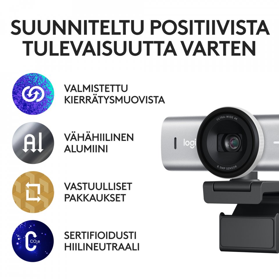 Kokousta, suoratoista ja hallitse MX Brion terävällä Ultra HD 4K – tarkkuudella Kaksi kertaa parempi kasvojen näkyvyys ja kaksi kertaa tarkemmat kuvan yksityiskohdat vaikeassa valaistuksessa(2), kuvan parannus tekoälyllä, Login suunnittelema objektiivi, 70 % suuremmat pikselit(1) ja tähän mennessä suurin verkkokameratunnistimemme. Hienosäädä videota hienosäätimillä(3) ja näytä työsi Show Mode -tilassa.