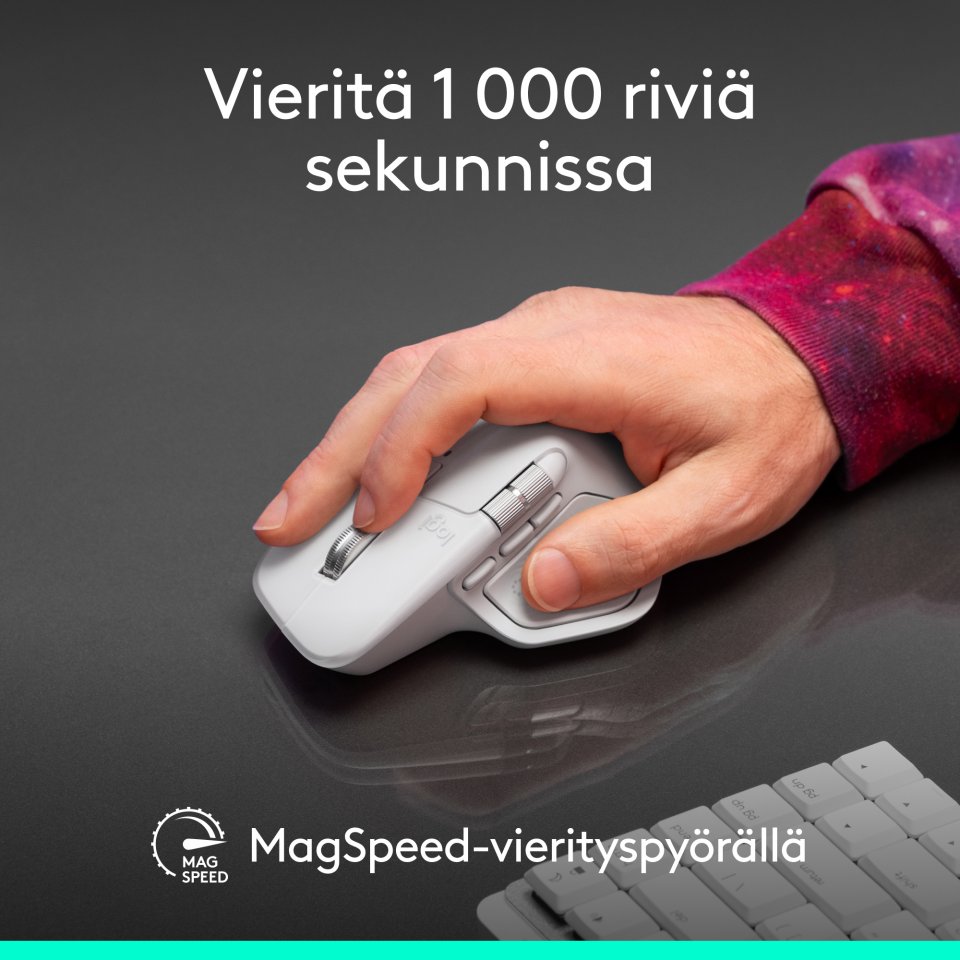 Vieritä 1 000 riviä sekunnissa ja pysähdy pikselintarkasti MagSpeed- vierityspyörällä – Logitechin nopeinta, hiljaisinta ja tarkinta vierittämistä. Nauti kaksi kertaa tehokkaammista yhteyksistä USB- C- sovittimella (ei sisälly toimitukseen), edistyksellisellä radiosirulla ja optimoidulla antennilla, jotka takaavat nopeamman, vahvemman ja luotettavan suorituskyvyn – tai voit myös halutessasi käyttää Bluetoothia.