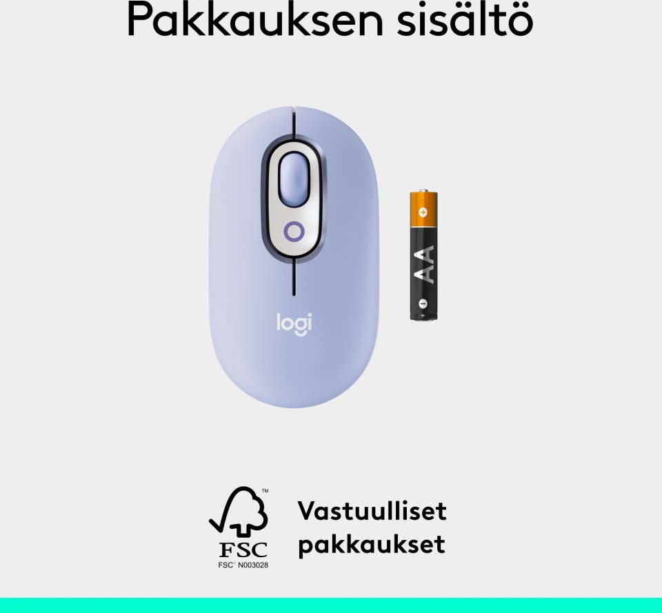 Valmistettu kierrätysmuovista: POP Mousen muoviosat sisältävät 37– 68 % kierrätysmuovia väristä riippuen (4). Vastuullisissa pakkauksissa käytetään FSC-sertifioitua paperia.