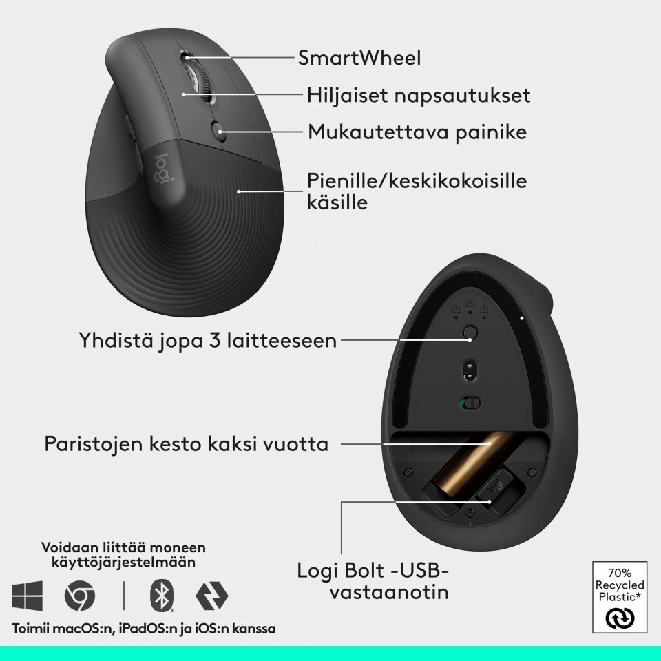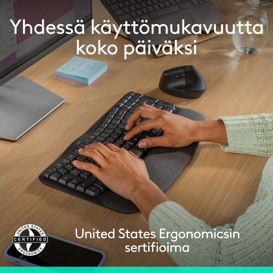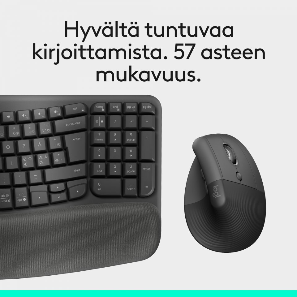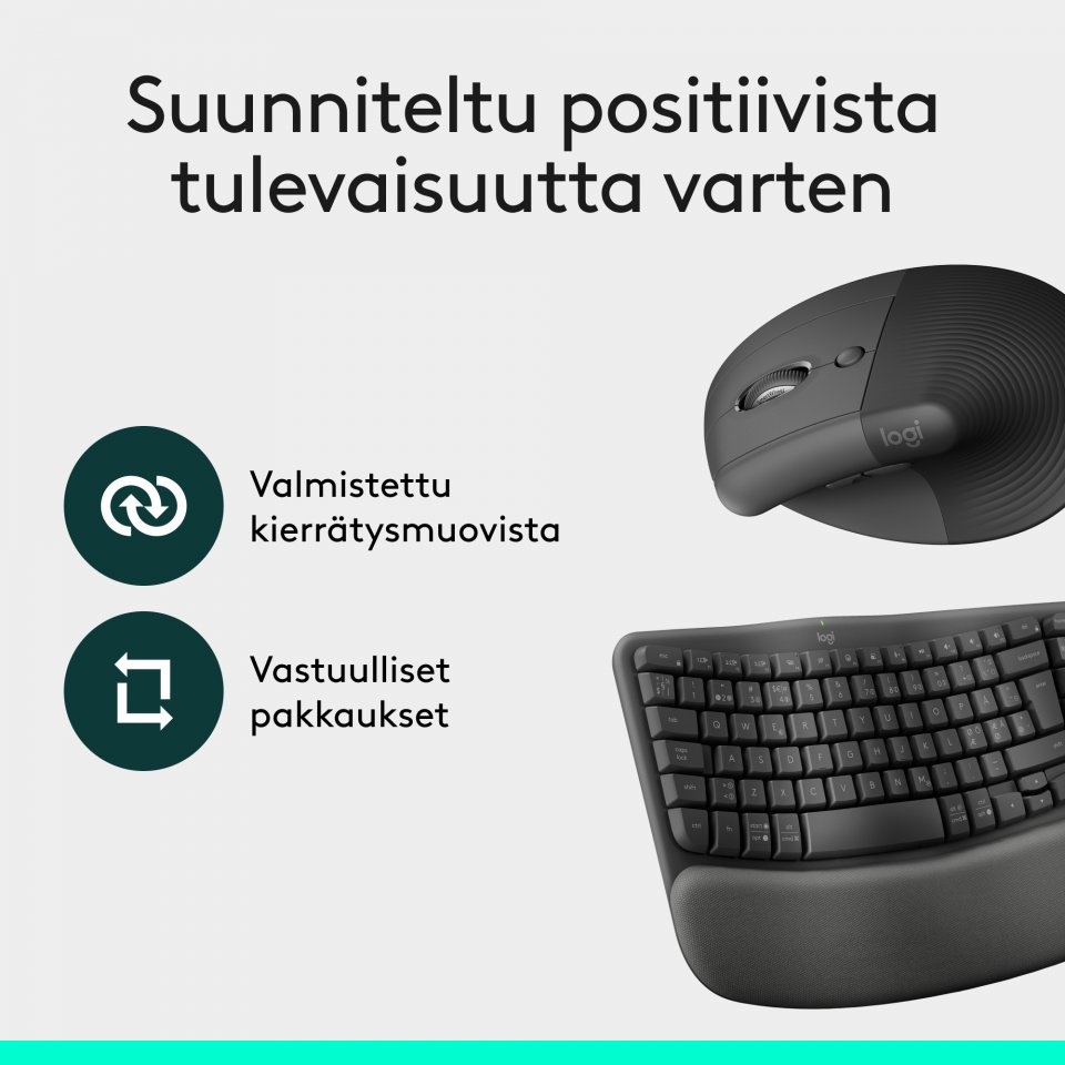 koko päivän. Pienille ja keskikokoisille käsille sopivat Wave Keys ja ergonominen Lift pystyhiiri on suunniteltu mukaviksi koko päiväksi, ja ne on valmistettu kierrätysmuovista.