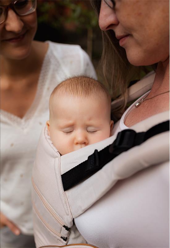 • Vastasyntynyttä voi kantaa pystyasennossa ortopedisesti oikeassa M-asennossa kantajan vatsaa vasten turvallisesti ja luonnollisesti integroidun vauvatuen avulla.