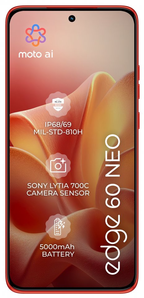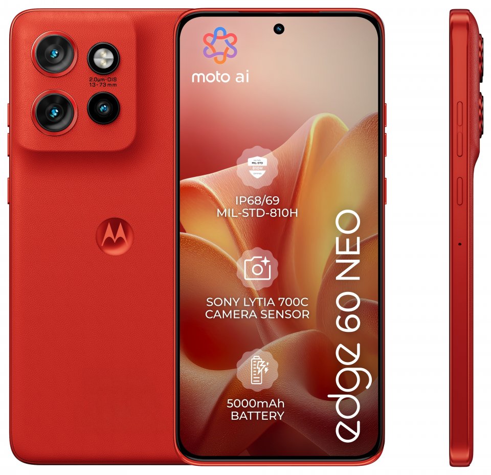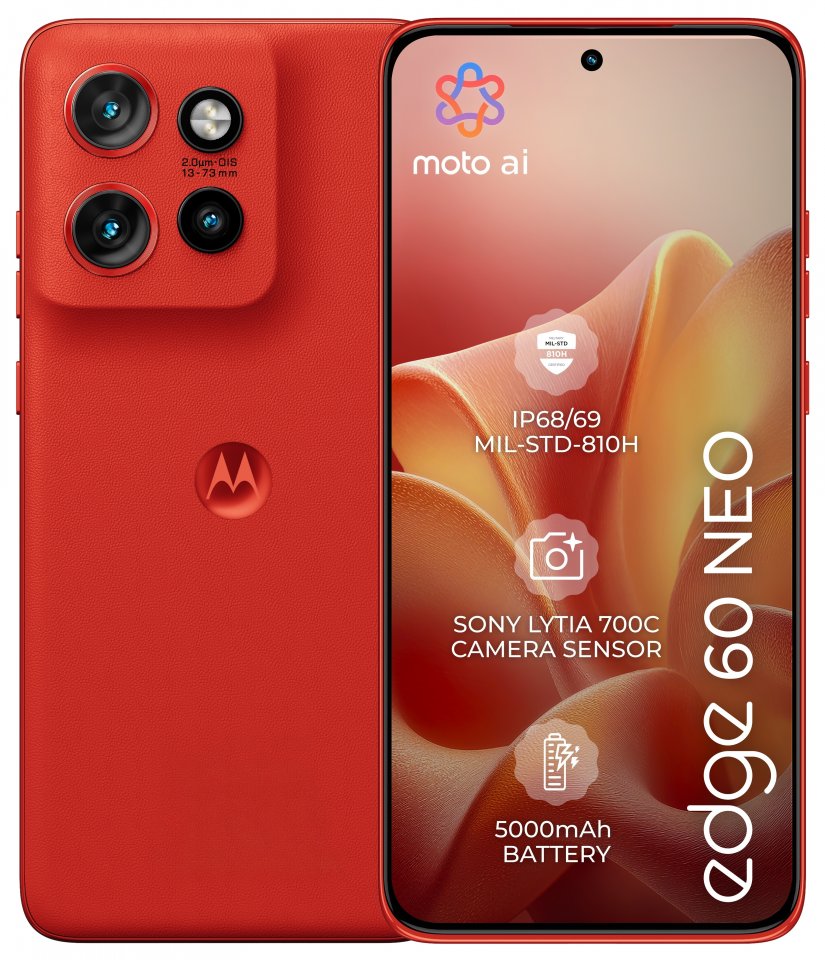 Motorola Edge 60 Neo sisältää 50 MP Sony LYTIA™ -pääkamera, 13 MP ultralaajakulmakameran Macro Vision -toiminnolla sekä 10 MP telekameran 3x optisella zoomilla. Moto ai24 -tekoäly auttaa tallentamaan upeita kuvia ja muistaa elämän yksityiskohdat. Lisäksi etukamera on 32 MP ja tukee Quad Pixel -teknologiaa, joka parantaa selfieiden laatua.
