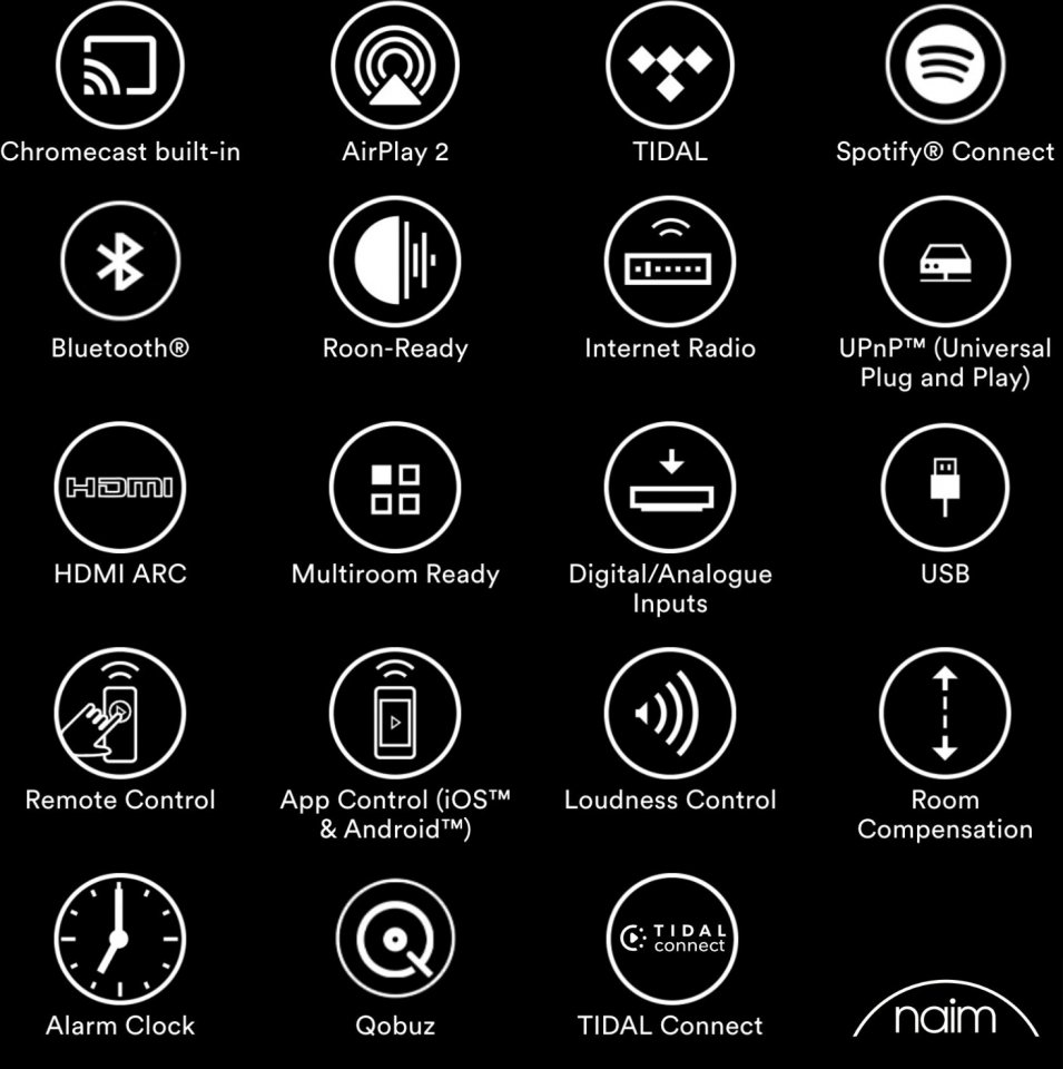 • Laitteen ohjaus mukana tulevalla kaukosäätimellä, HDMI-ARC-yhteydellä ja/tai Naim App -ohjaussovelluksella (saatavilla iPad-, iPhone-, iPod Touch- ja Android-laitteille)