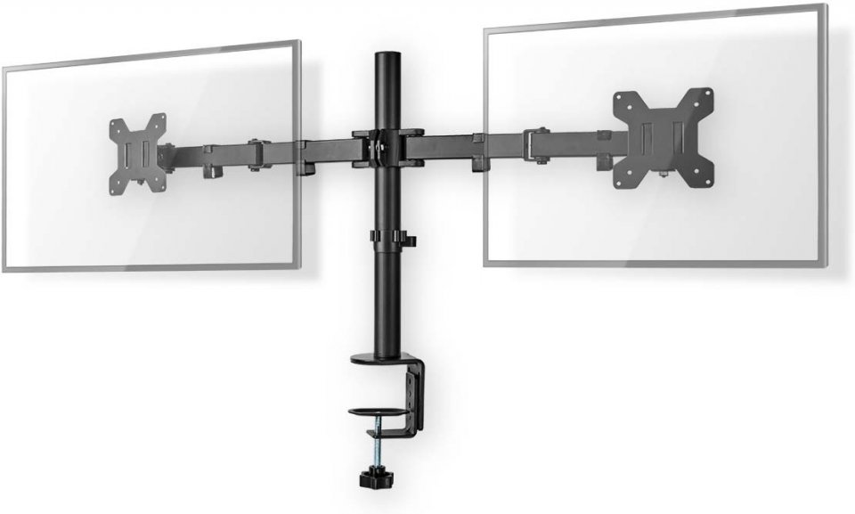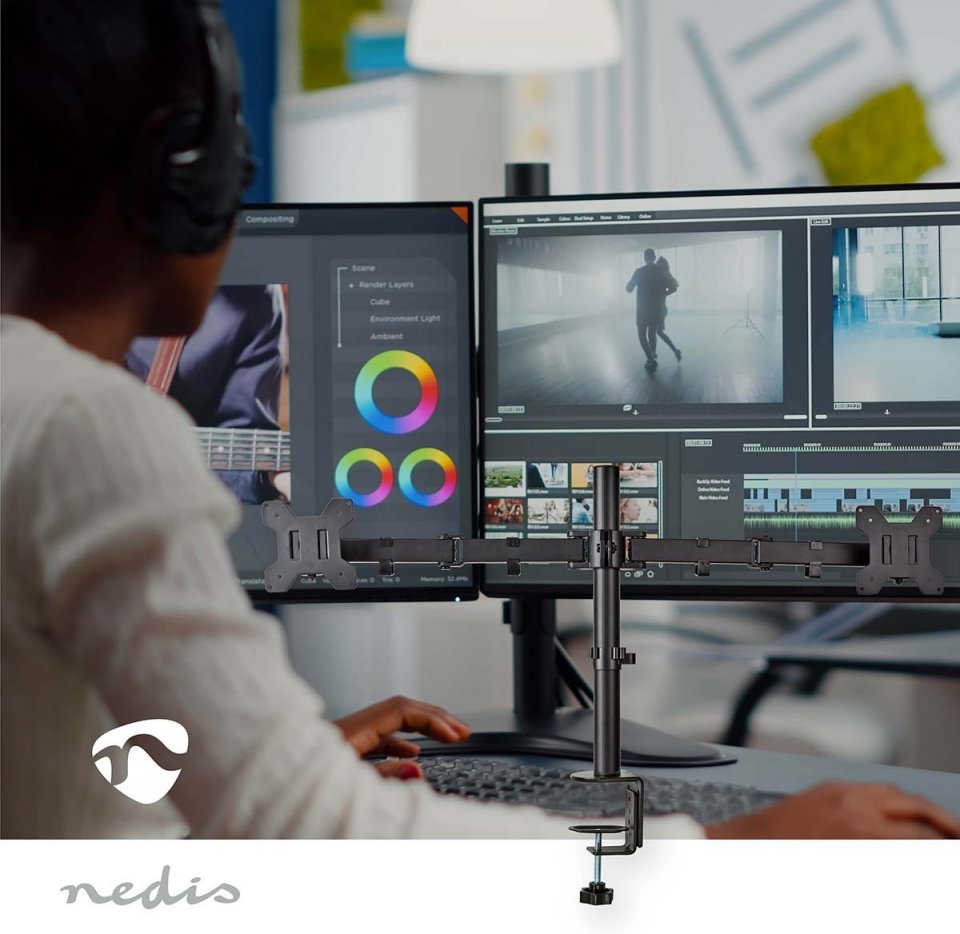 Tämä Nedis Näyttöteline sopii kahdelle litteälle näytölle, joiden koko on enintään 32 tuumaa. Monipuolisten kallistus- (50°), kierto- (360°) ja kääntymismahdollisuuksien (180°) ansiosta voit säätää telineen mihin tahansa katselukulmaan. Tämä teline on loistava valinta tilaa säästävään sijoittamiseen työpöydille - pöytäkiinnikkeellä asennat sen helposti ja nopeasti.