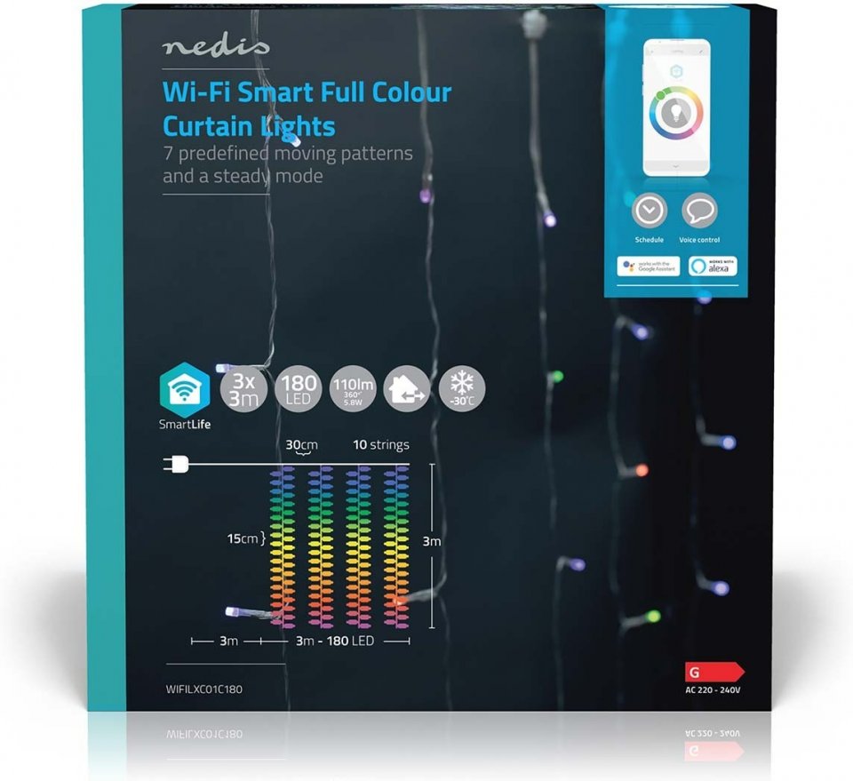 Nedis-Wi-Fi -koristevaloverhossa on 180 RGB LED -valoa, ja jokaista 10 valonauhaa kohden on 18 LED-valoa. Tämä värikäs koristevaloverho soveltuu seinä-, katto- ja ikkunakoristeeksi. Valittavana kirkkauden säätö, seitsemän esimääritettyä liikekuviota, sekä tasainen tila. Koristevalosarjaa voi käyttää sekä sisä- että ulkotiloissa. Ohjaus tapahtuu helppokäyttöisellä Nedis SmartLife -sovelluksella.