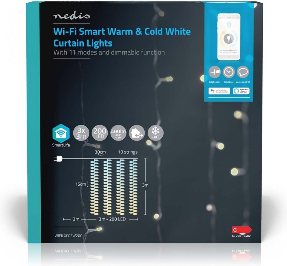 Nedis SmartLife -koristevaloverho, 200 LED, valkoisen valon sävyt, WiFi, 3 x 3 m