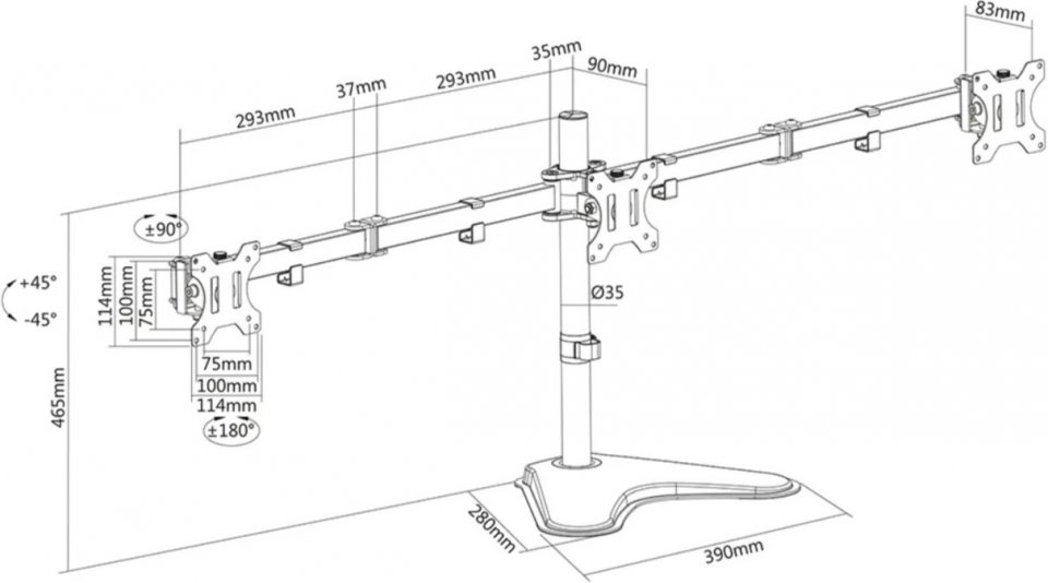 Neomounts FPMA-D550DD on monipuolisilla säädöillä varustettu pöytäteline kolmelle 13" - 27" näytölle. Teline on varustettu pöytäjalustalla, joten pöytään ei tarvitse tehdä mitään muutoksia. Näyttöjä on helppo nostaa, laskea, kallistaa ja kääntää, joten ergonomisen työskentelyasennon löytäminen on vaivatonta. Teline avulla säästät tilaa työpöydältä ja kätevät kaapelikiinnikkeet takaavat siistin asennuksen.