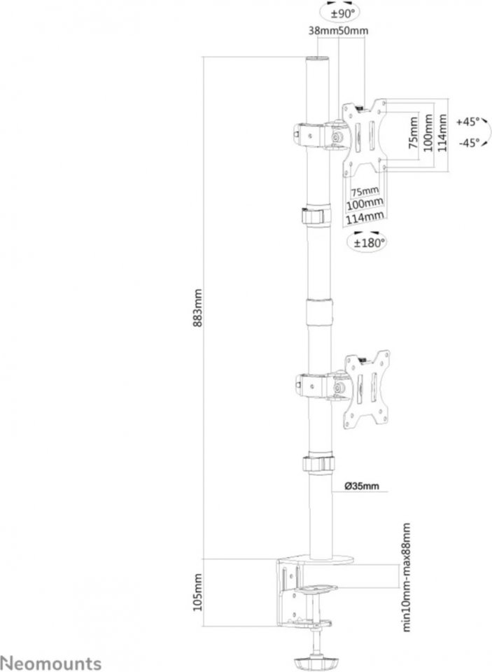 Neomounts FPMA-D550DV on monipuolisilla säädöillä varustettu pöytäteline kahdelle päällekkäiselle 10″-32″ näytölle, jonka paino on maksimissaan 8 kg. Näyttöjä on helppo nostaa, laskea, kallistaa ja kääntää, joten ergonomisen työskentelyasennon löytäminen on vaivatonta. Teline on kiinnitettävissä joko reunapuristimella tai läpivientikiinnikkeellä. Pöytätelineen avulla säästät tilaa työpöydältä ja kätevät kaapelikiinnikkeet takaavat siistin asennuksen.