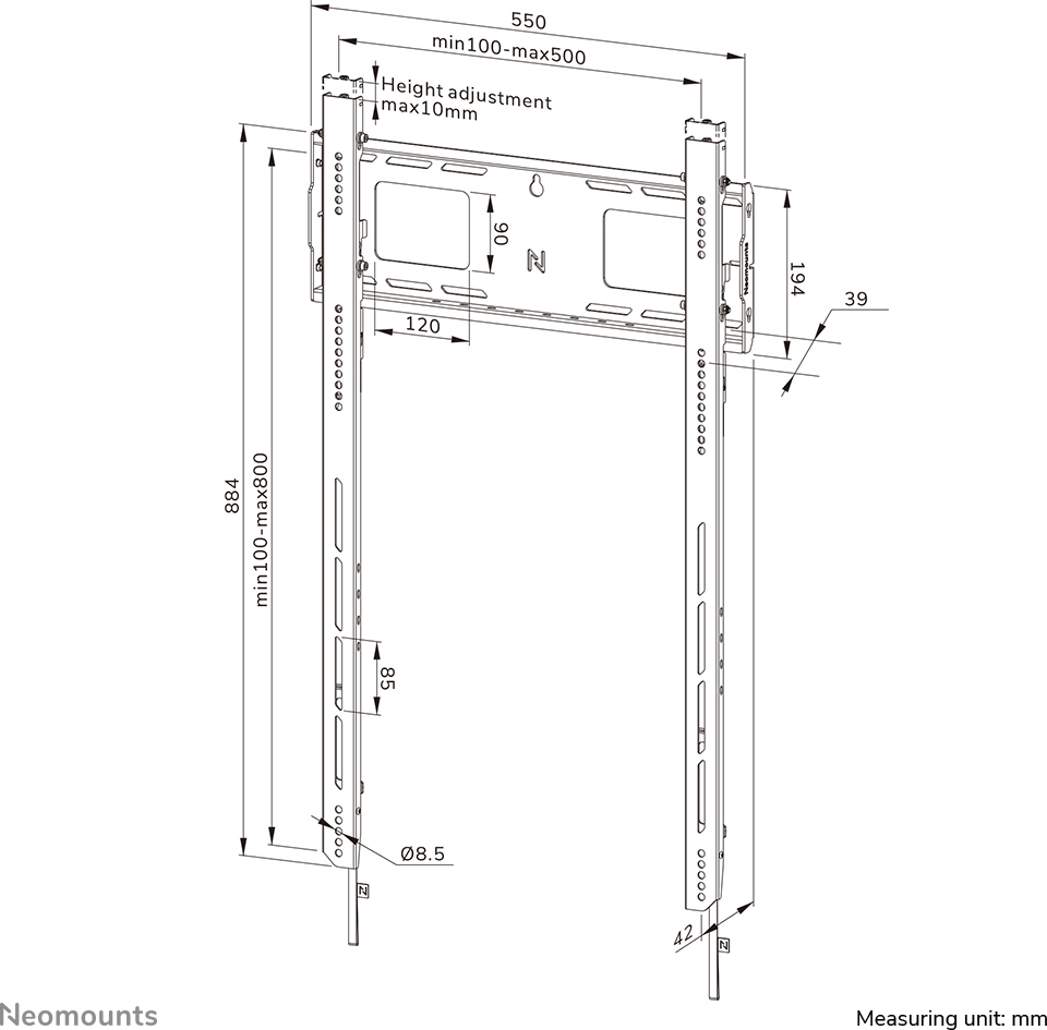 4,2 cm profiilin syvyys ja VESA-yhteensopivuus 100×100 – 500×800 mm kattavat laajan valikoiman suuria näyttöjä.