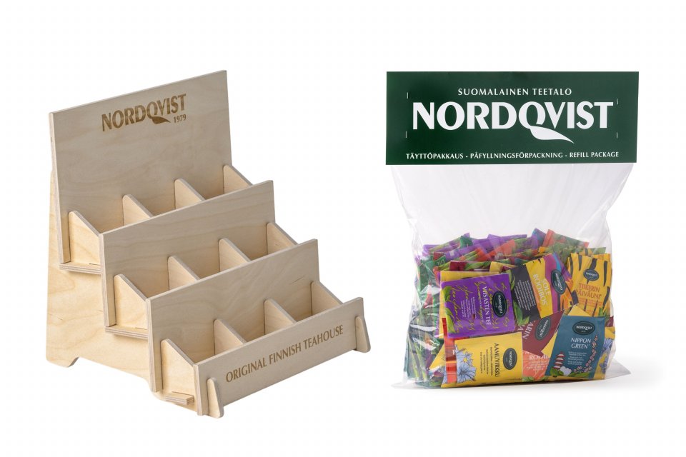 Suomalaisesta puusta valmistettu teeteline, johon mahtuu esille jopa 80 laadukasta Nordqvist teepussia.