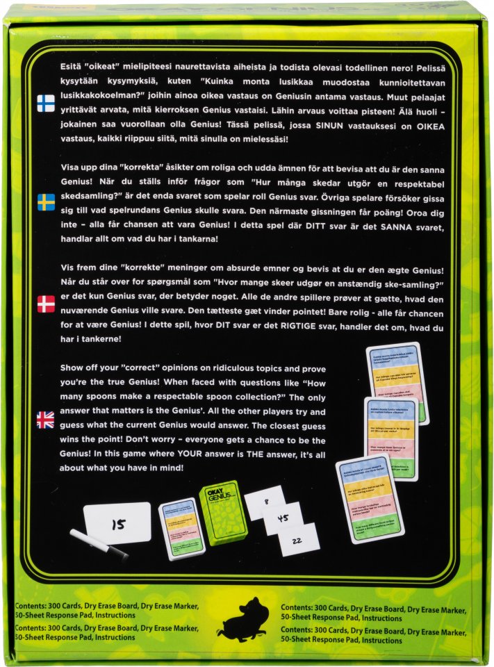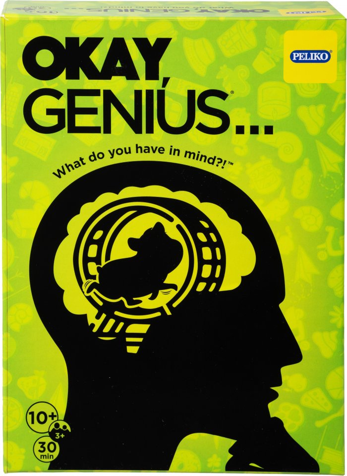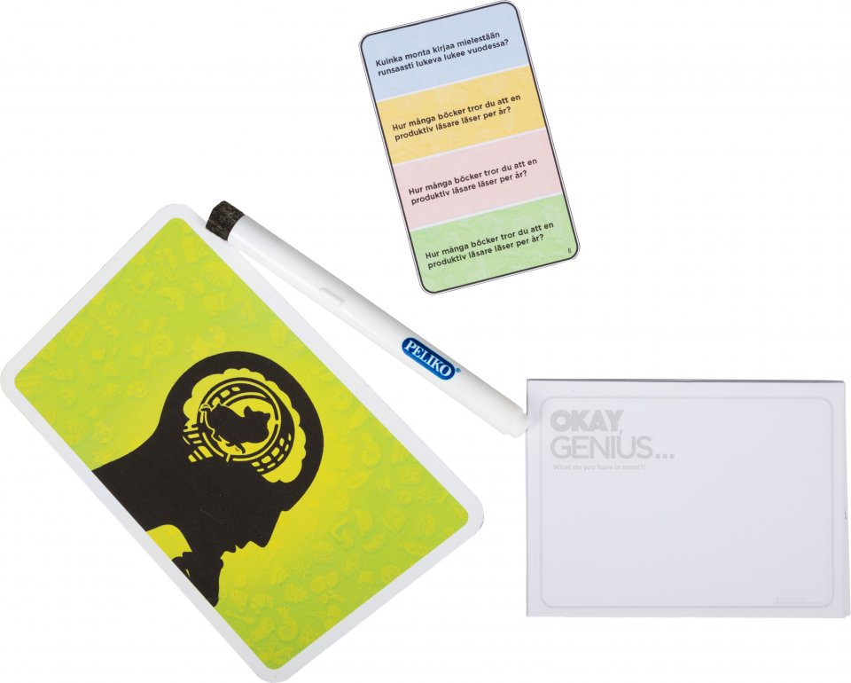 Okay, Genius on hilpeä seurapeli kaveriporukan illanistujaisiin, perheen yhteiseen peli-iltaan tai vaikka junamatkalle ajanvietteeksi. Esitä ‘oikeat’ mielipiteesi naurettavista aiheista ja todista olevasi todellinen nero! Pelissä kysytään kysymyksiä, kuten ‘Kuinka monta lusikkaa muodostaa kunnioitettavan lusikkakokoelman?’ joihin ainoa oikea vastaus on Geniusin antama vastaus. Muut pelaajat yrittävät arvata, mitä kierroksen Genius vastaisi. Lähin arvaus voittaa pisteen! Älä huoli – jokainen saa vuorollaan olla Genius! Tässä pelissä, jossa SINUN vastauksesi on OIKEA vastaus, kaikki riippuu siitä, mitä sinulla on mielessäsi!