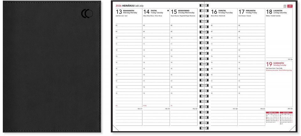 Kalenterin aukeamalla näkyy viikon jokainen päivä tunnin tarkkuudella klo 8–19. Lisäksi mukana on liputuspäivät, kansalliset pyhät ja nimipäivät, jotka on merkitty sekä aukeamilla että luettelona. Tämä helpottaa tärkeiden päivien seuraamista ilman tarvetta tarkistaa erikseen kalenterista.