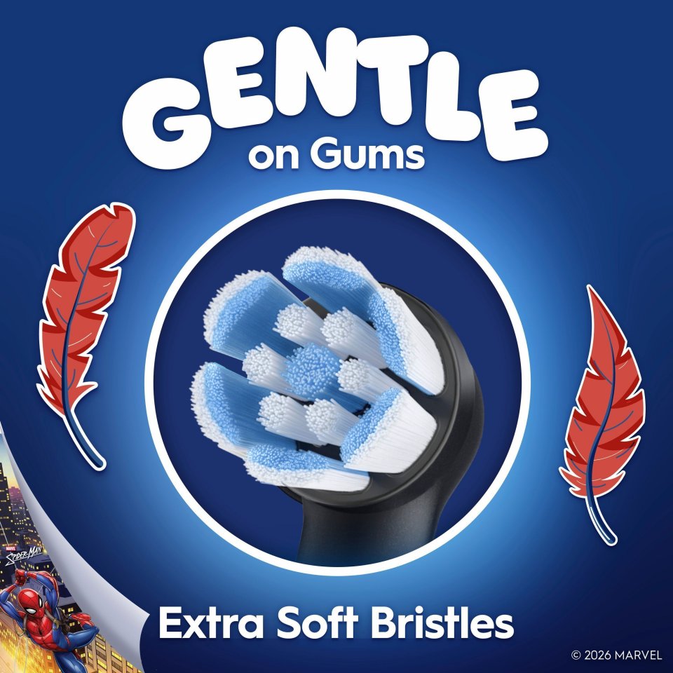 Yli 6-vuotiaille lapsille tarkoitettu Oral-B iO Kids -vaihtoharja ilahduttaa Spider-Manilla samalla, kun se puhdistaa hellävaraisen tehokkaasti hammaslääkäreiden suosittelemien Oral-B-hammasharjojen tapaan. Erittäin pehmeät harjakset ja pieni pyöreä pää on suunniteltu erityisesti lapsille. Ne ovat armottomia reikiintymiselle ja hellävaraisia ikenille ja heiluville hampaille.