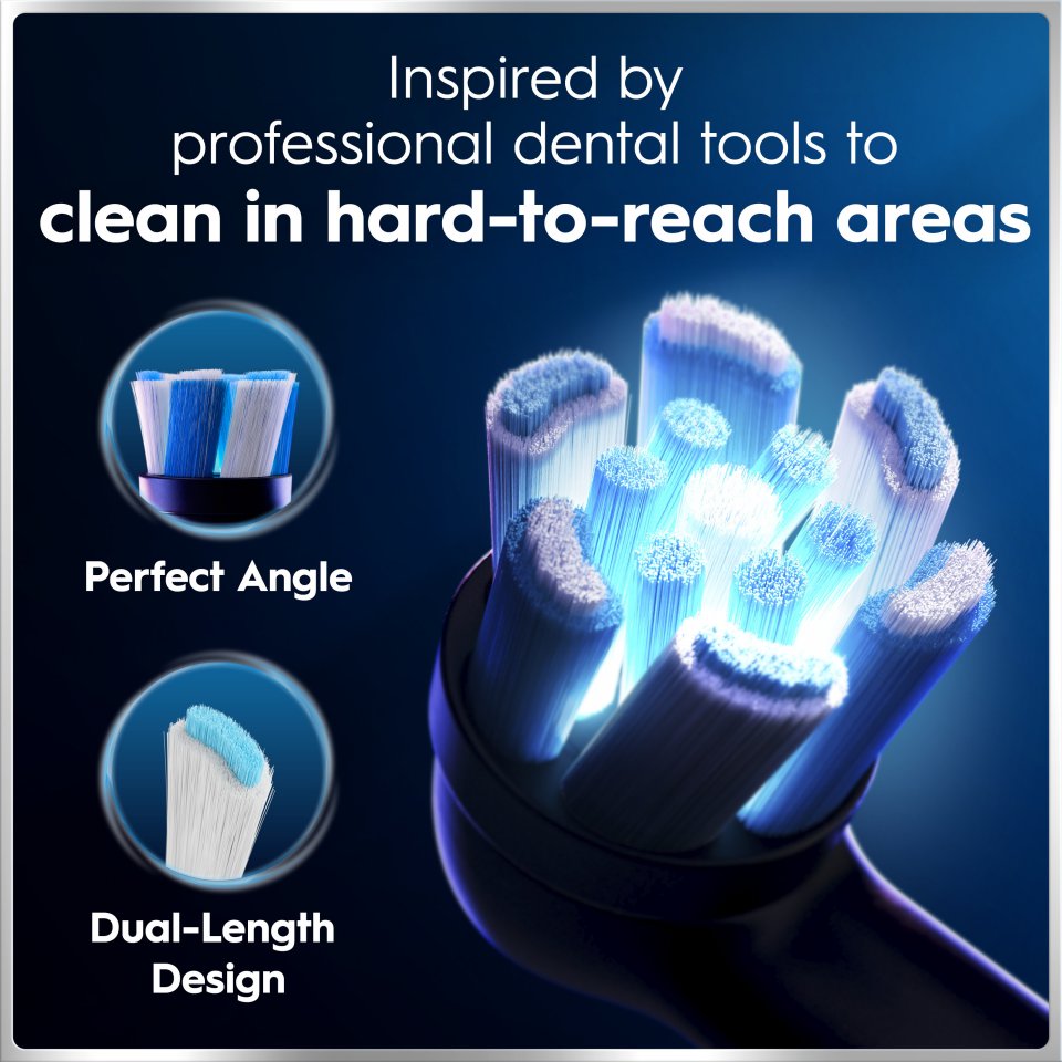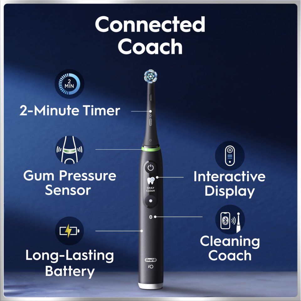 Oral-B iO 6 -sähköhammasharja käyttää Oral-B:n parasta puhdistusteknologiaa ja yhdistää ainutlaatuisen, hammaslääkärien innoittaman pyöreän harjaspään hellävaraiseen mikrovärähtelyyn antaen ammattimaisen puhtaan tunteen joka päivä. Kliinisesti todistettu teknologia. Suunniteltu ehkäisemään ongelmia ennen kuin ne alkavat. Lataa ORAL-B-sovellus, niin voit seurata aikaa ja harjausaluetta sekä varmistaa, ettei yksikään kohta jää harjaamatta. Synkronoi Apple Health -sovelluksen kanssa ja seuraa keskimääräistä harjausaikaasi joka päivä. Vaihda harjaspää 3 kuukauden välein parhaan puhdistustehon säilyttämiseksi.
