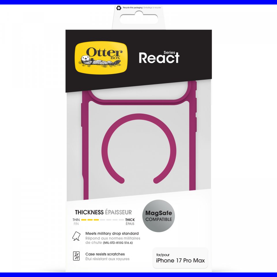 React-kuori sisältää vähintään 40 % kierrätysmateriaalia ja se toimitetaan kierrätettävässä pakkauksessa. Lisäksi se on suunniteltu toimimaan saumattomasti OtterBoxin lasisuojien kanssa, mikä mahdollistaa täydellisen suojauksen koko puhelimelle.