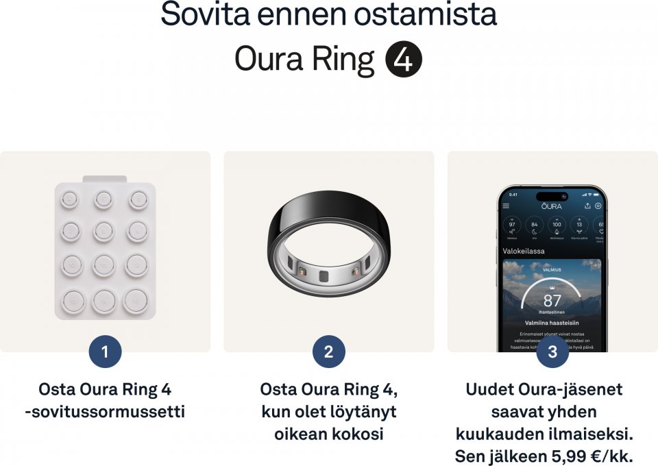 Saat sormuksen ostaessasi Oura-jäsenyyden ensimmäisen kuukauden ilmaiseksi. Sen jälkeen 5,99 euroa kuukaudessa. Tarjous koskee vain uusia jäseniä. Tai voit ostaa vuosijäsenyyden ennakkoon hintaan 69,99 euroa. Jäsenyys on liitetty tiliisi Oura-sovelluksen kautta, ei fyysiseen sormukseen.