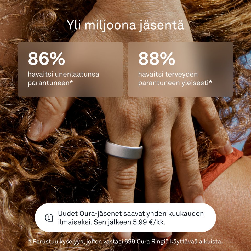 Saat sormuksen ostaessasi Oura-jäsenyyden ensimmäisen kuukauden ilmaiseksi. Sen jälkeen 5,99 euroa kuukaudessa. Tarjous koskee vain uusia jäseniä. Tai voit ostaa vuosijäsenyyden ennakkoon hintaan 69,99 euroa. Jäsenyys on liitetty tiliisi Oura-sovelluksen kautta, ei fyysiseen sormukseen.
