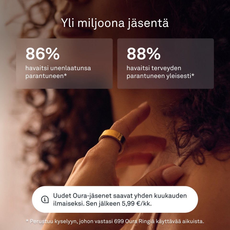 Saat sormuksen ostaessasi Oura-jäsenyyden ensimmäisen kuukauden ilmaiseksi. Sen jälkeen 5,99 euroa kuukaudessa. Tarjous koskee vain uusia jäseniä. Tai voit ostaa vuosijäsenyyden ennakkoon hintaan 69,99 euroa. Jäsenyys on liitetty tiliisi Oura-sovelluksen kautta, ei fyysiseen sormukseen.