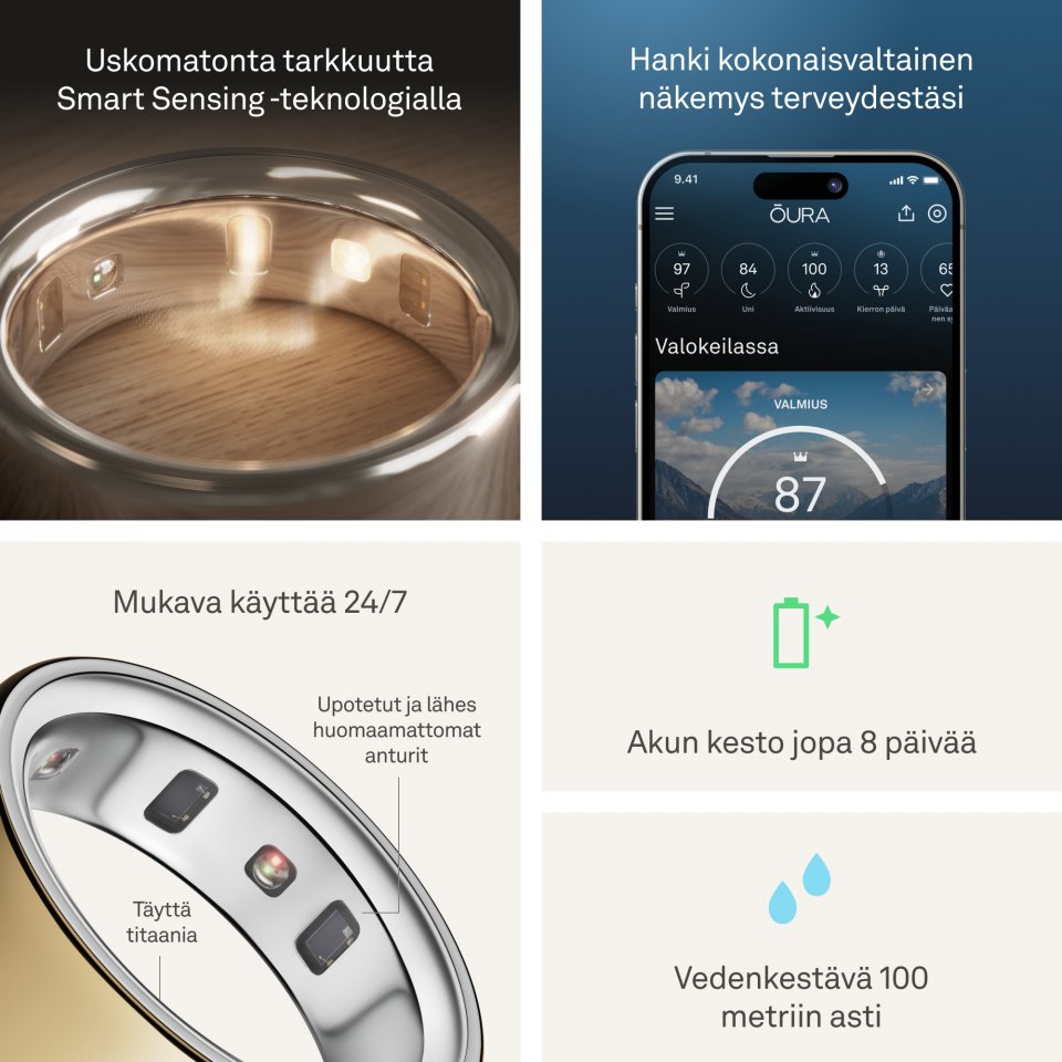 Esittelyssä Oura Ring 4 – vallankumouksellisen älysormuksen viimeisin kehitysaste. Oura Ring 4 tuo sinut lähemmäs kaikkein tärkeintä – terveyttäsi. Päivitetty ja kokonaan titaanista valmistettu malli perustuu Smart Sensing -teknologiaan. Se ei pelkästään mittaa biometriikkaasi, vaan mukautuu kehoosi ja tarjoaa tietoa yli 30 biometrisestä ominaisuudesta, kuten unesta, valmiudesta, aktiivisuudesta, sydämen terveydestä, stressistä ja naisen terveydestä. Oura Ring seuraa terveyttäsi hiljaa ja mukavasti, ja akun kesto on jopa 8 päivää – saatat jopa unohtaa sormuksen olevan sormessasi.