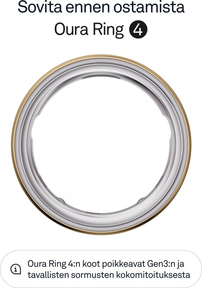 Esittelyssä Oura Ring 4 - vallankumouksellisen älysormuksen viimeisin kehitysaste. Oura Ring 4 tuo sinut lähemmäs kaikkein tärkeintä – terveyttäsi. Päivitetty ja kokonaan titaanista valmistettu malli perustuu Smart Sensing -teknologiaan. Se ei pelkästään mittaa biometriikkaasi, vaan mukautuu kehoosi ja tarjoaa tietoa yli 30 biometrisestä ominaisuudesta, kuten unesta, valmiudesta, aktiivisuudesta, sydämen terveydestä, stressistä ja naisen terveydestä. Oura Ring seuraa terveyttäsi hiljaa ja mukavasti, ja akun kesto on jopa 8 päivää – saatat jopa unohtaa sormuksen olevan sormessasi.