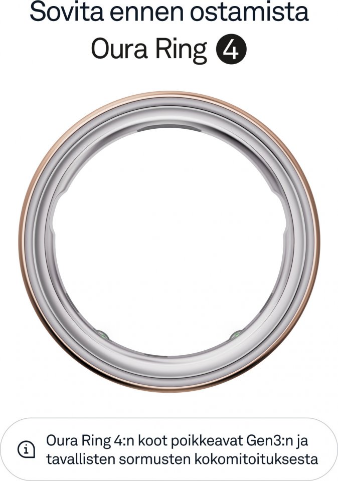 Esittelyssä Oura Ring 4 - vallankumouksellisen älysormuksen viimeisin kehitysaste. Oura Ring 4 tuo sinut lähemmäs kaikkein tärkeintä – terveyttäsi. Päivitetty ja kokonaan titaanista valmistettu malli perustuu Smart Sensing -teknologiaan. Se ei pelkästään mittaa biometriikkaasi, vaan mukautuu kehoosi ja tarjoaa tietoa yli 30 biometrisestä ominaisuudesta, kuten unesta, valmiudesta, aktiivisuudesta, sydämen terveydestä, stressistä ja naisen terveydestä. Oura Ring seuraa terveyttäsi hiljaa ja mukavasti, ja akun kesto on jopa 8 päivää – saatat jopa unohtaa sormuksen olevan sormessasi.
