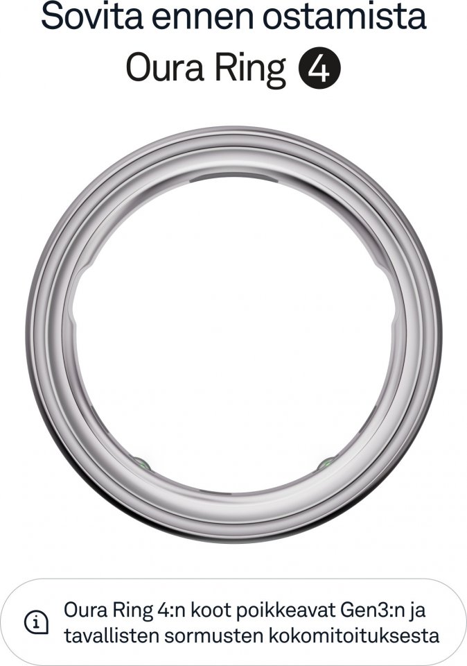 Esittelyssä Oura Ring 4 - vallankumouksellisen älysormuksen viimeisin kehitysaste. Oura Ring 4 tuo sinut lähemmäs kaikkein tärkeintä – terveyttäsi. Päivitetty ja kokonaan titaanista valmistettu malli perustuu Smart Sensing -teknologiaan. Se ei pelkästään mittaa biometriikkaasi, vaan mukautuu kehoosi ja tarjoaa tietoa yli 30 biometrisestä ominaisuudesta, kuten unesta, valmiudesta, aktiivisuudesta, sydämen terveydestä, stressistä ja naisen terveydestä. Oura Ring seuraa terveyttäsi hiljaa ja mukavasti, ja akun kesto on jopa 8 päivää – saatat jopa unohtaa sormuksen olevan sormessasi.
