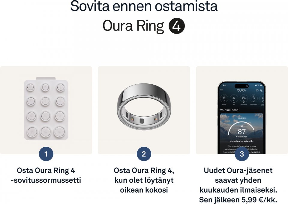 Saat sormuksen ostaessasi Oura-jäsenyyden ensimmäisen kuukauden ilmaiseksi. Sen jälkeen 5,99 euroa kuukaudessa. Tarjous koskee vain uusia jäseniä. Tai voit ostaa vuosijäsenyyden ennakkoon hintaan 69,99 euroa. Jäsenyys on liitetty tiliisi Oura-sovelluksen kautta, ei fyysiseen sormukseen.