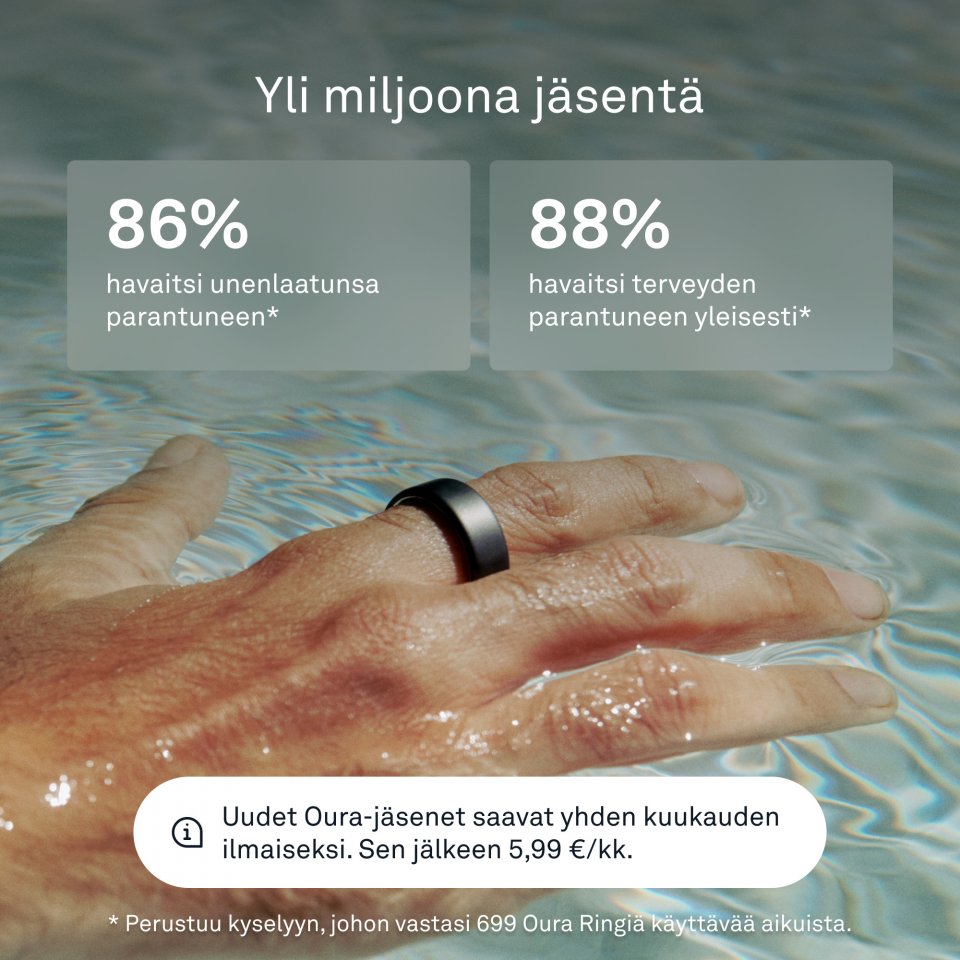 Saat sormuksen ostaessasi Oura-jäsenyyden ensimmäisen kuukauden ilmaiseksi. Sen jälkeen 5,99 euroa kuukaudessa. Tarjous koskee vain uusia jäseniä. Tai voit ostaa vuosijäsenyyden ennakkoon hintaan 69,99 euroa. Jäsenyys on liitetty tiliisi Oura-sovelluksen kautta, ei fyysiseen sormukseen.