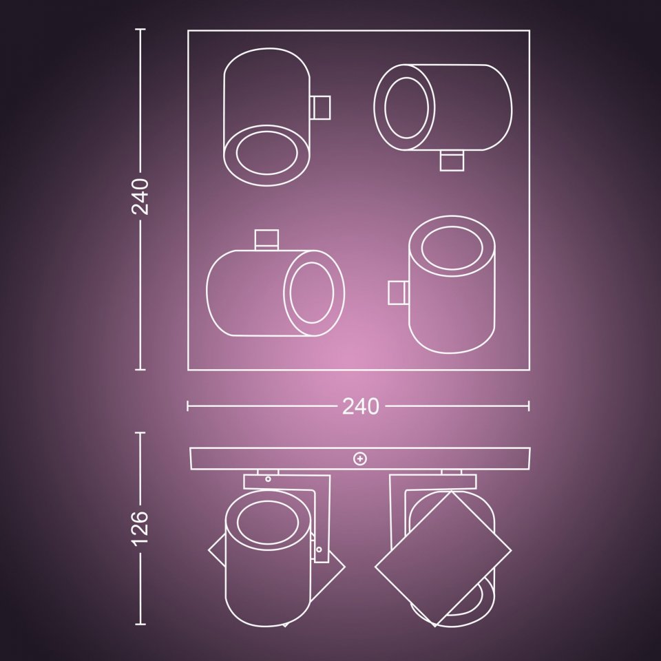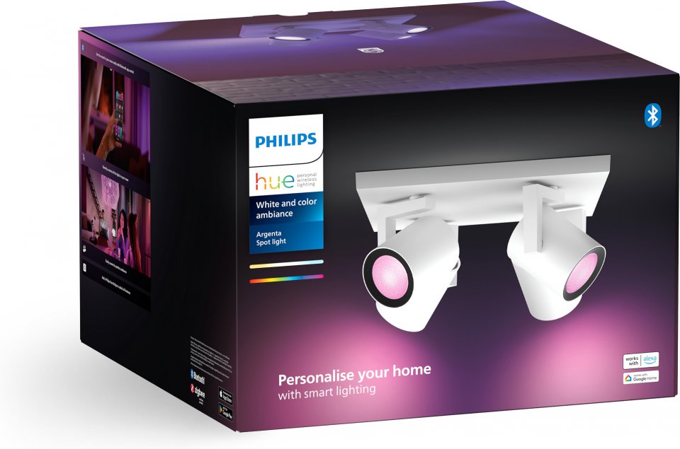 Luo tunnelmaa valaistuksella kotiisi Philips Hue Argenta -valaisimen ja pakkaukseen sisältyvien White and color ambiance GU10 -spottien avulla. Langatonta himmennystä tukeva kohdevalaisin toistaa valoa lukemattomissa väreissä ja valkoisen valon sävyissä. Kokeile pehmeää lämmintä valkoista valoa rentoutumiseen ja energistä kylmää valkoista aamulla virkistymiseen. Tai sukella yli 16 miljoonan värin sateenkaareen ja valitse mielesi mukaan - tunnelma on taattu! Hallitset valoja helposti älypuhelimella, Philips Hue -lisätarvikkeilla tai jopa puhekomennoin virtuaaliavustajan avulla. Tässä valkoisessa kohdevalaisimessa on neljä säädettävää spottia, jotka voit suunnata mihin tahansa haluamaasi kohtaan.