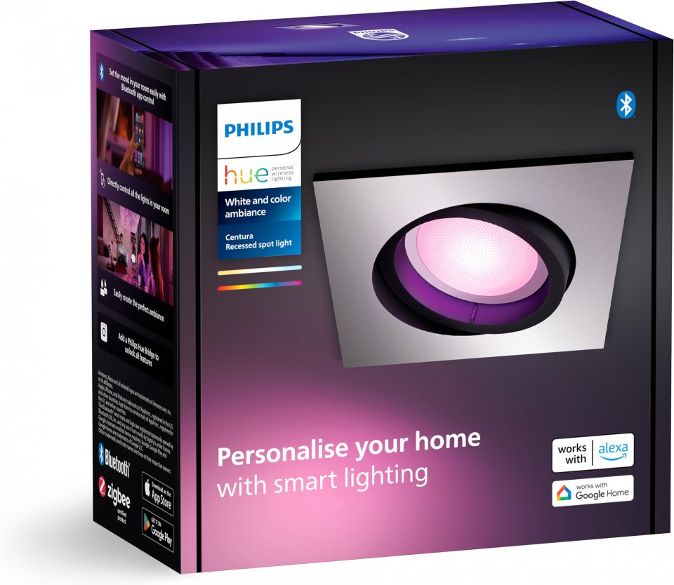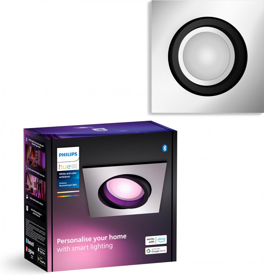 Modernit ja tyylikkäät Philips Hue Centura -upotettavat kohdevalaisimet ovat White and color ambiance -sarjaa, eli valoa voidaan himmentää ja asettaa toistamaan mitä vain valkoisen valon sävyä tai värivaloa – valittavanasi on miljoonia sävyjä. Spotti voidaan kohdistaa mihin tahansa suuntaan tuomaan juuri oikeanlaista tunnelmaa ja valaistusta. Tämä valaisin on alumiinin värinen ja neliön muotoinen.