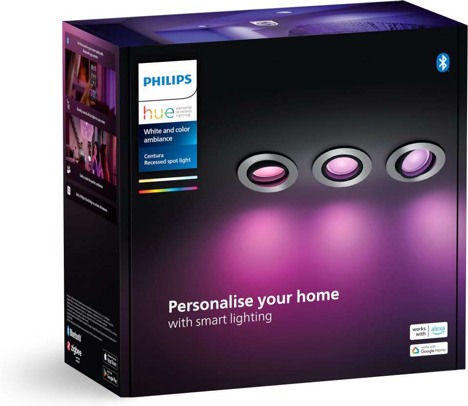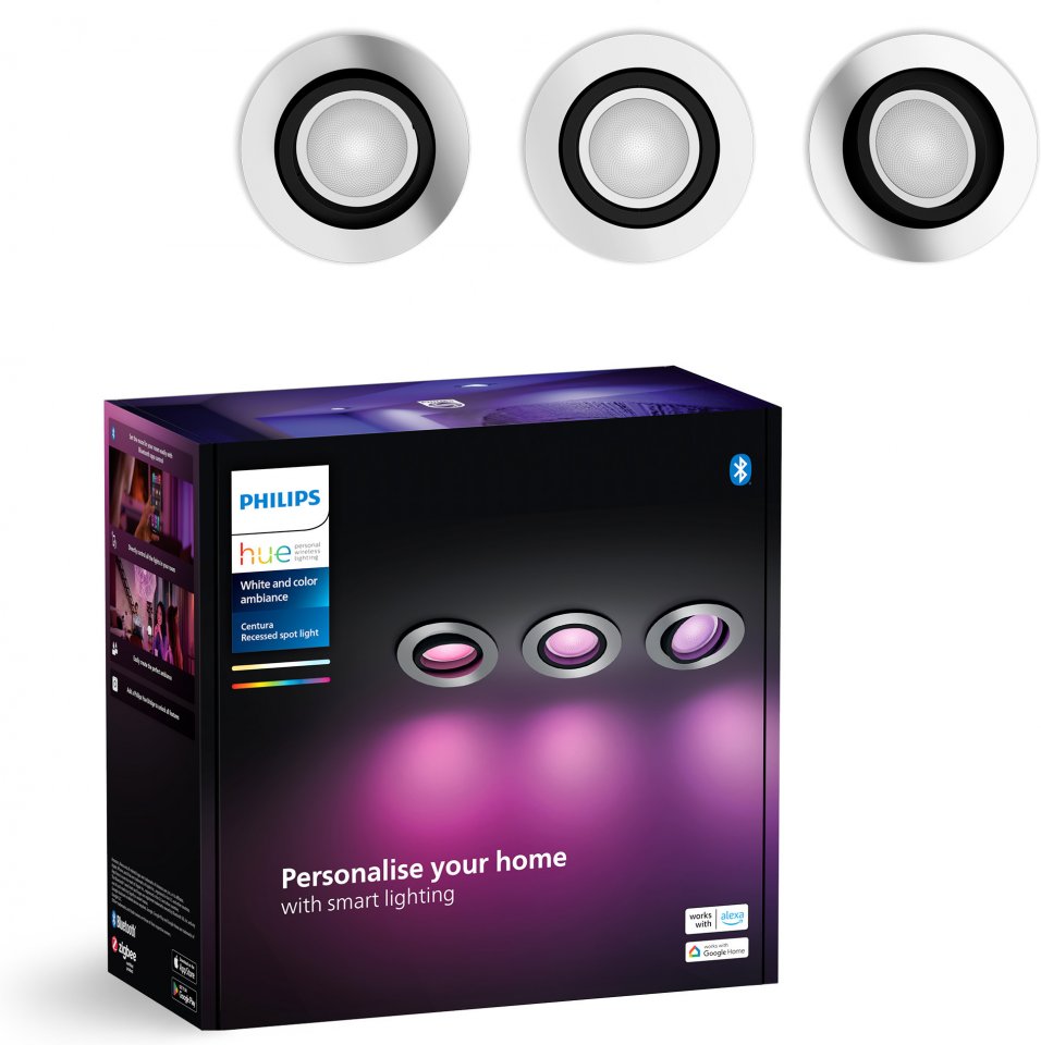 Tyylikkäät pyöreät Philips Hue Centura -upotettavat kohdevalaisimet ovat White and color ambiance -sarjaa, eli valoa voidaan himmentää ja asettaa toistamaan mitä vain valkoisen valon sävyä tai värivaloa – valittavanasi on miljoonia sävyjä. Spotti voidaan kohdistaa mihin tahansa suuntaan tuomaan juuri oikeanlaista tunnelmaa ja valaistusta. Nämä modernit älykohdevalaisimet tulevat kolmen kappaleen settinä.