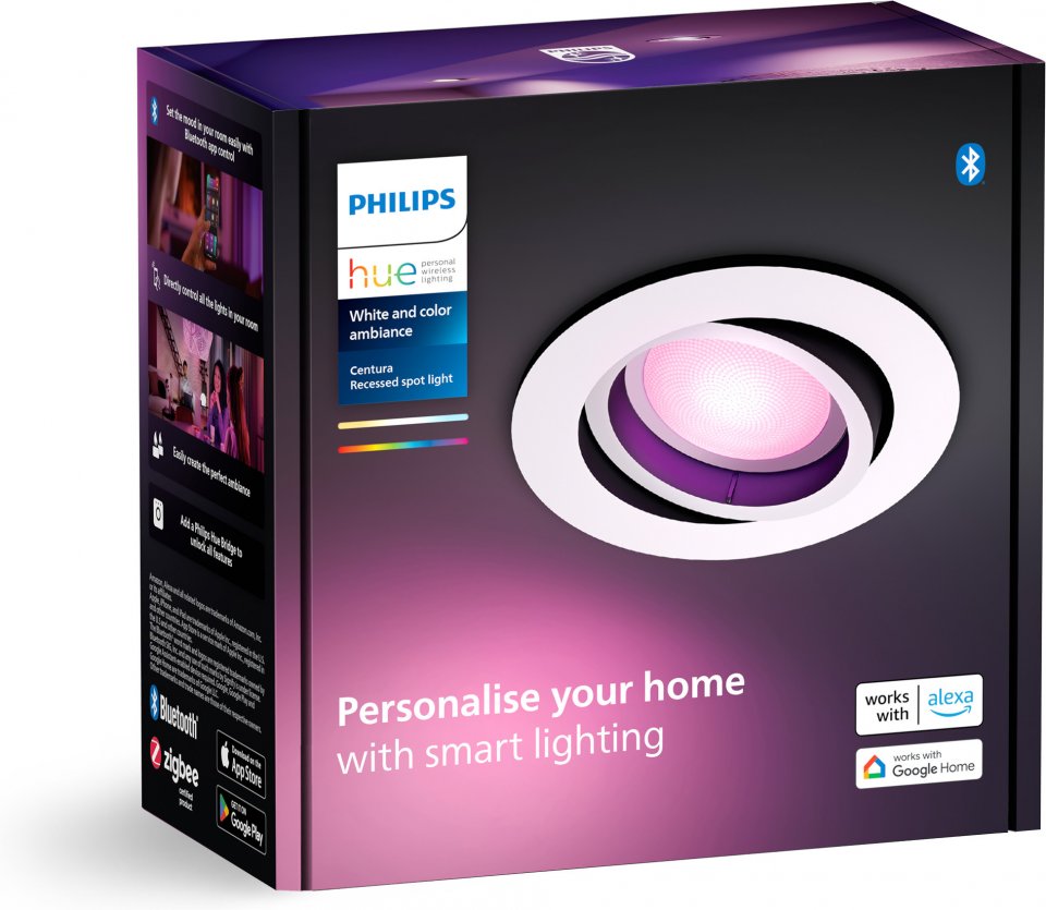 Modernit ja tyylikkäät Philips Hue Centura -upotettavat kohdevalaisimet ovat White and color ambiance -sarjaa, eli valoa voidaan himmentää ja asettaa toistamaan mitä vain valkoisen valon sävyä tai värivaloa – valittavanasi on miljoonia sävyjä. Spotti voidaan kohdistaa mihin tahansa suuntaan tuomaan juuri oikeanlaista tunnelmaa ja valaistusta. Tämä valaisin on valkoinen ja muodoltaan pyöreä.
