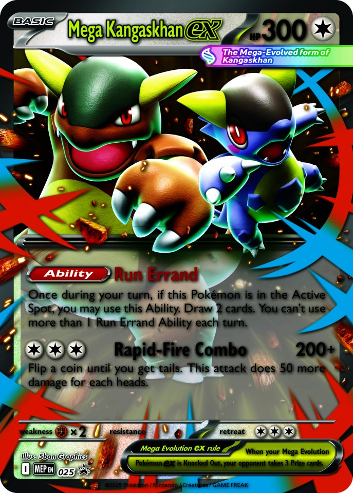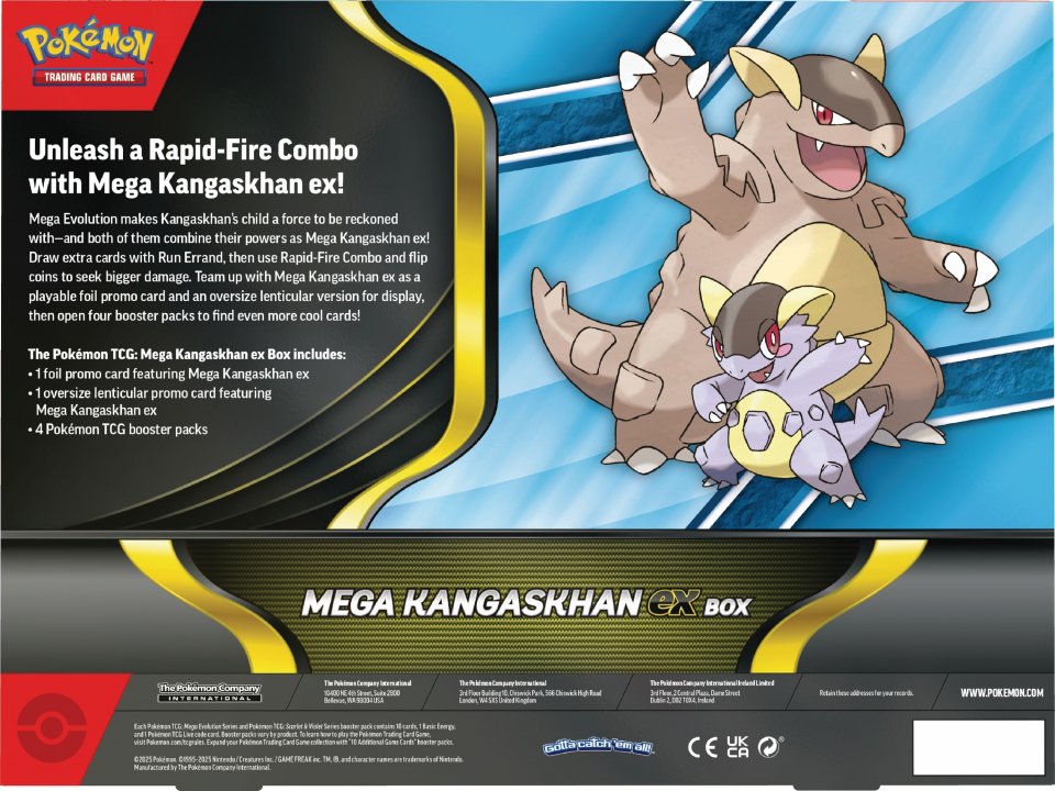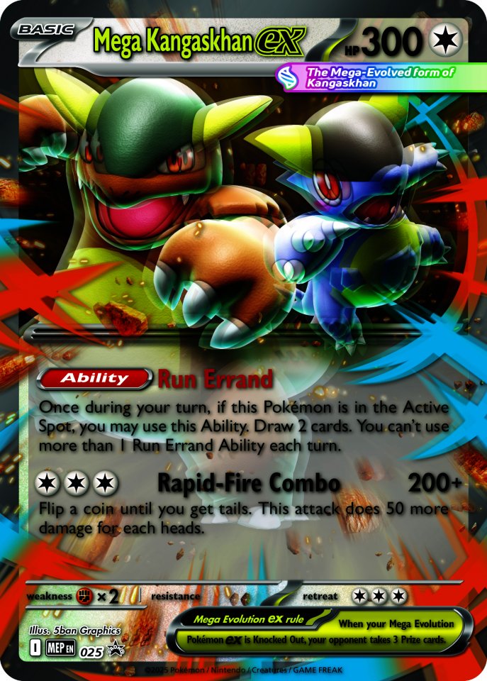 Mega Evolution tekee Kangaskhanin poikasesta voiman, jota ei voi sivuuttaa, ja molemmat yhdistävät voimansa Mega Kangaskhan ex:ksi! Vedä lisäkortteja Run Errand -toiminnolla ja käytä Rapid-Fire Comboa heittääksesi kolikkoa ja tavoitellaksesi suurempaa vahinkoa. Liity Mega Kangaskhan ex:n joukkoon pelattavana foil promo -korttina ja suurena lentikulaarisena versiona, ja avaa sitten neljä booster-pakkaa löytääksesi vielä enemmän upeita kortteja!