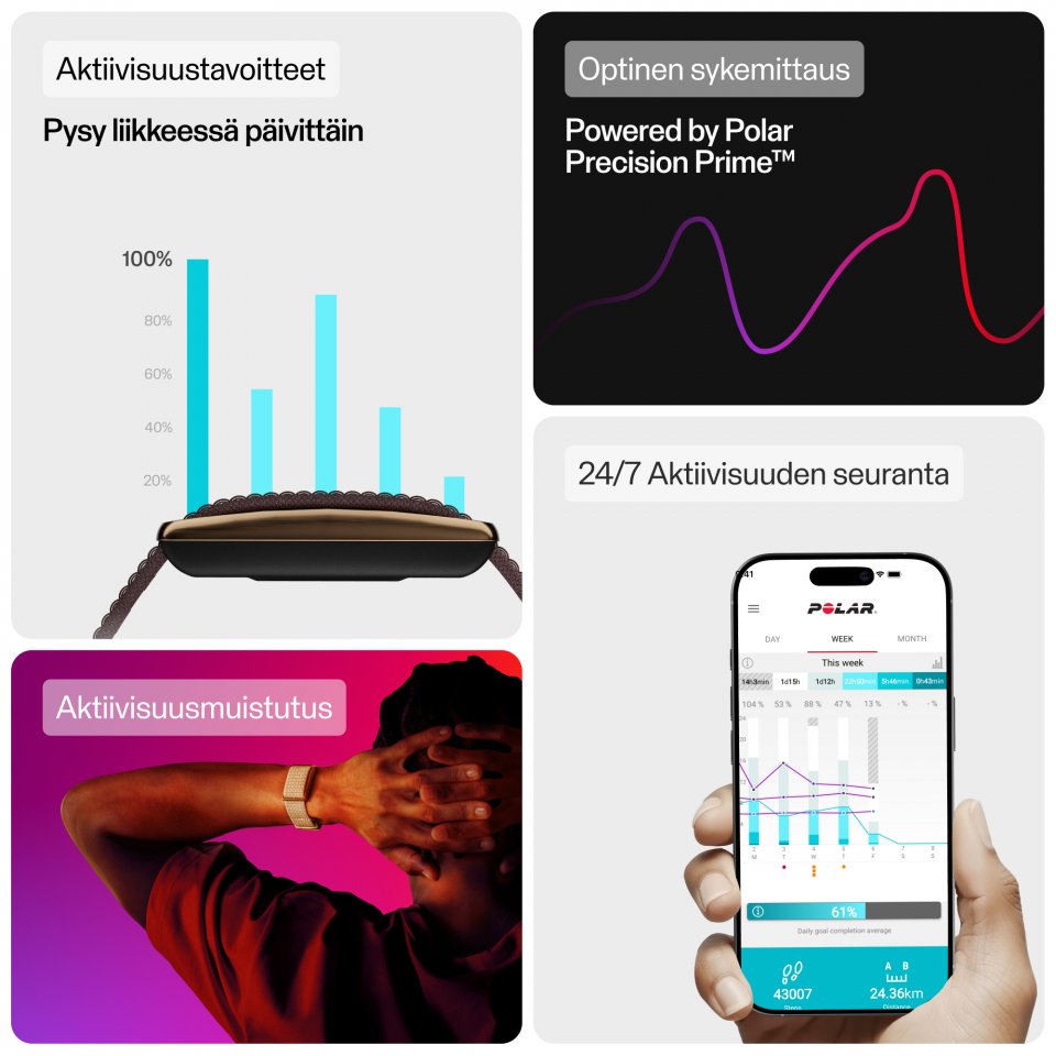 Polar Precision Prime™ -teknologia tarjoaa tarkkaa optista sykkeenmittausta, joka perustuu tieteelliseen tutkimukseen. Laitteen muistiin tallentuu jopa 4 viikon tiedot, ja se synkronoi datan automaattisesti Polar Flow -sovellukseen Bluetooth 5.1 -yhteydellä. Laite on vesitiivis 30 metriin ja latautuu USB-C -kaapelilla.