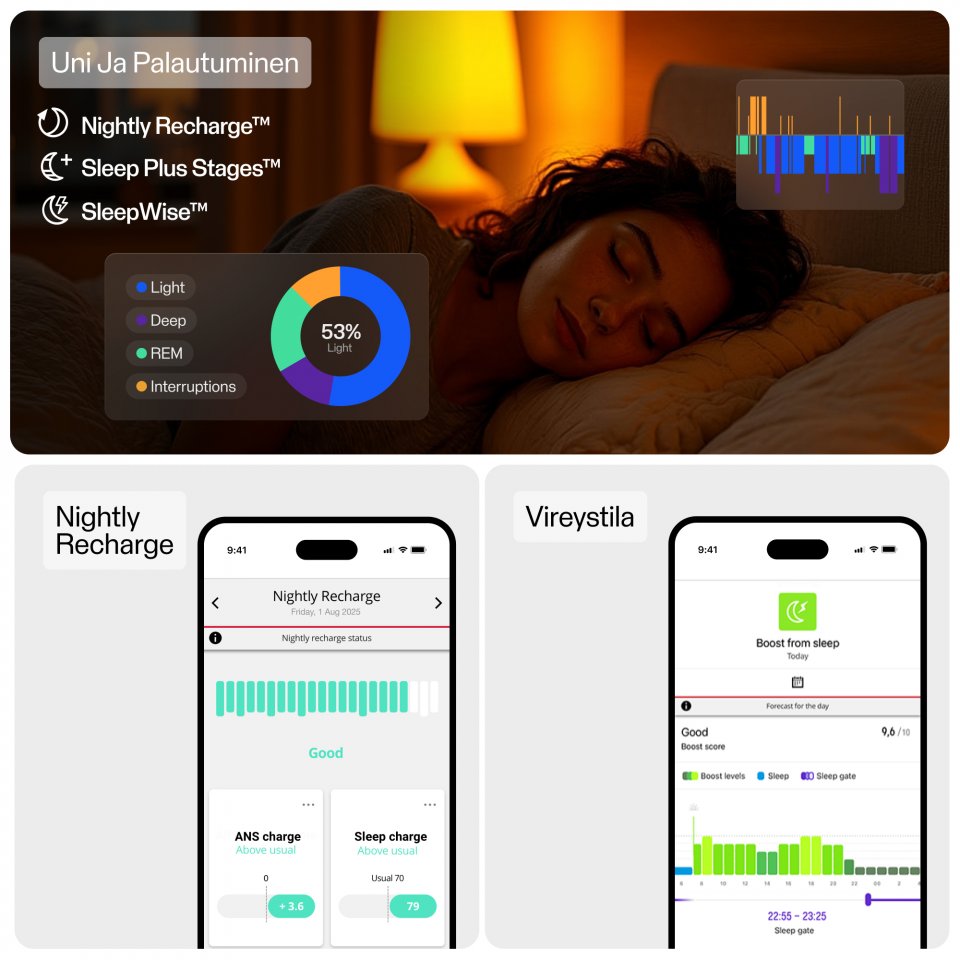Laitteella voi seurata unen eri vaiheita, kuten kevyttä, syvää ja REM-unta Sleep Plus Stages™ -tekniikalla. Unipisteet yhdistävät unen keston ja laadun yhdeksi kokonaisarvioksi. Nightly Recharge™ mittaa palautumista yön aikana, ja Sleep Gate ennustaa nukahtamisvalmiuden. SleepWise™ arvioi unen vaikutusta vireystilaan ja suorituskykyyn päivän aikana.