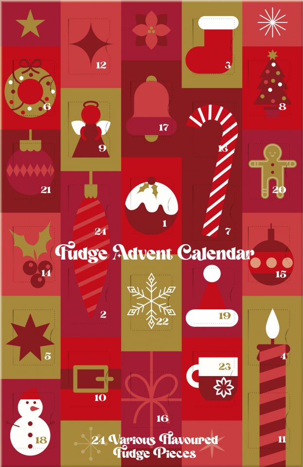 Tässä joulukalenterissa suklaa on korvattu laadukkailla toffee- ja fudge-makeisilla. Jokaisesta luukusta paljastuu pehmeä toffeemakeinen tai fudge-pala – makuina voitoffee ja kolme erilaista fudgea: merisuola & karamelli, vanilja tai kerma. Kalenterin tyylikäs mutta jouluinen ulkoasu sopii monenlaiseen sisustukseen ja ilahduttaa aattoaamuun asti. Täydellinen valinta joulun odotukseen tai lahjaksi makean ystävälle!