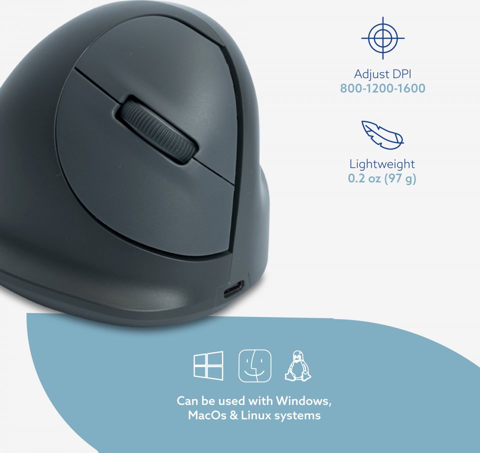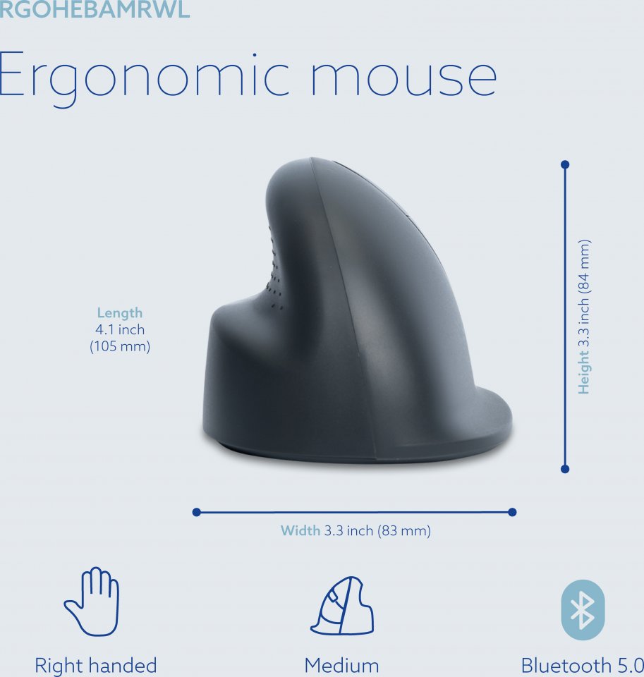Pystysuorassa R-Go HE Basic -hiiressä on kaareva muoto, joka seuraa kätesi luonnollista asentoa. Tämä varmistaa, että kätesi on rento asennossa hiirtä käytettäessä. Pystysuuntainen muotoilu on tarkoitettu stimuloimaan hiiren liikettä, jota ergonomien neuvovat käsivarresta käsin. Tämä estää fyysiset valitukset, kuten RSI. Hiiressä on erityinen tukialue peukalolle ja pikkusormelle, jotta kaikki sormet ovat tuettuja. Tämä langaton hiiri voidaan yhdistää helposti Bluetoothin kautta. Ergonominen R-Go HE Basic -hiiri on aluksi saatavana vain oikeakätiseen käyttöön koossa M.