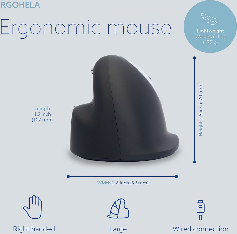 R-Go HE Break -hiiren pystysuora muotoilu ohjaa liikuttamaan hiirtä kyynärvarrella pelkän ranteen sijaan. Tämä vähentää rasitusvammojen, kuten hiirikäden (CANS), riskiä. Pyöreä muoto mahdollistaa käden ja ranteen luonnollisen, rentoutuneen asennon. Hiiri istuu mukavasti käteen ja tukee kaikkia sormia.