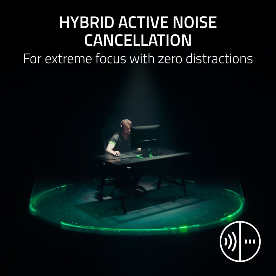 Irrotettava HyperClear Full-Band 12 mm -puomimikrofoni tallentaa äänen selkeästi ja vähentää taustamelua, mikä parantaa viestintää pelitilanteissa. Hybridinen aktiivinen melunvaimennus (ANC) sulkee tehokkaasti ympäristön äänet, jotta keskittyminen peliin säilyy.