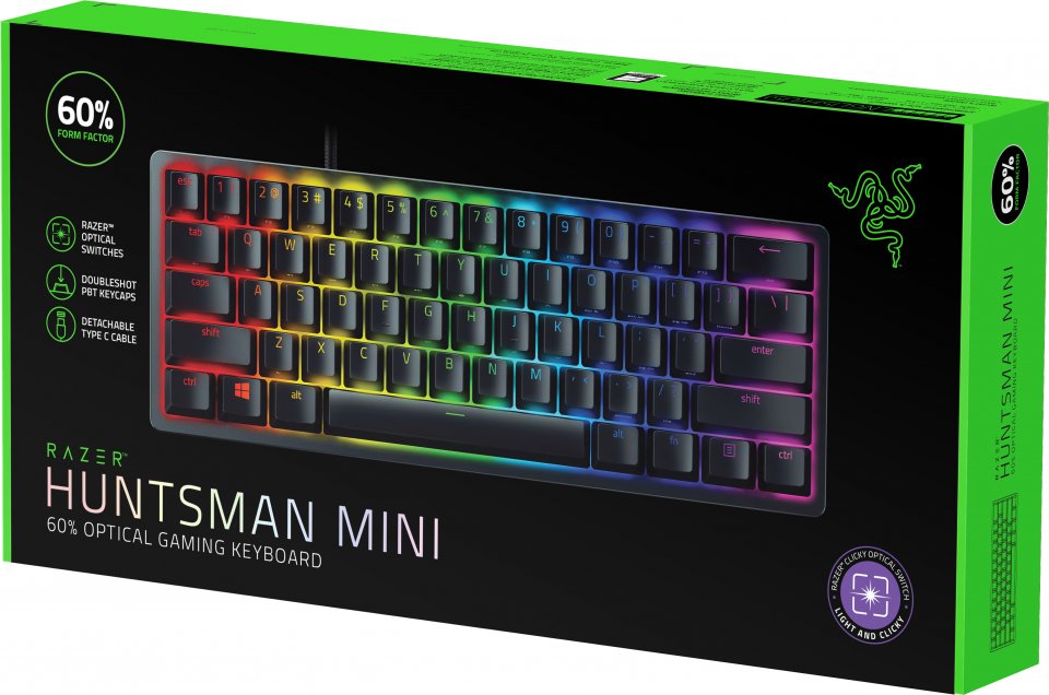 Razer Huntsman Mini on vaativaan pelikäyttöön suunniteltu 60%-kokoluokan pelinäppäimistö huippuluokan Razer Clicky Optical -kytkimillä. Pienen kokonsa ja suorituskykyisten kytkintensä lisäksi näppäimistö on varustettu kestävillä PBT Doubleshot -näppäinhatuilla, Chroma RGB -valaistuksella, ohjelmoitavilla painikkeilla sekä kestävällä alumiinirakenteella.