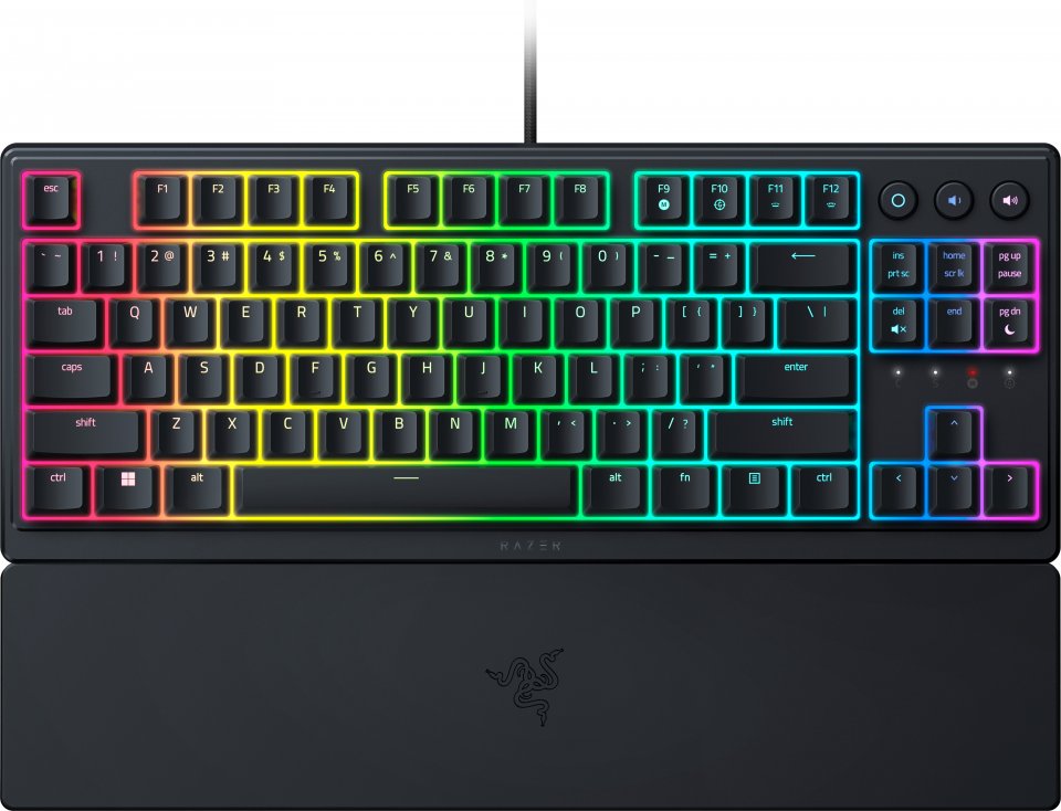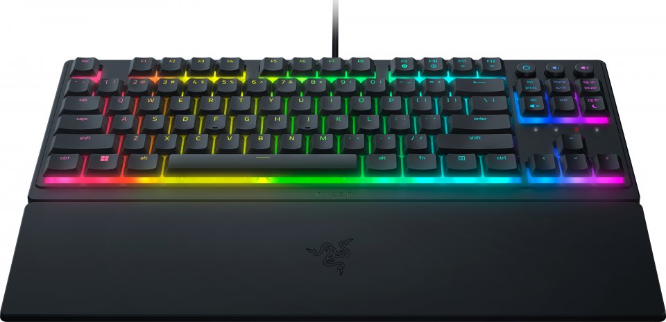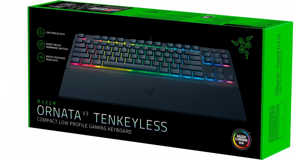 Razer Ornata V3 TKL on matalillla ja hiljaisilla membrane kytkimillä varustettu näppäimistö. Niissä on klicky kytkimien tuntuma, mutta pehmeä tuntuma. Näin ollen se sopii niin työ kuin pelikäyttöönkin. Näppäimistö on ergominen ja rannetuen avulla saat erittäin luonnollisen asennon käsillesi. Näppäinhatut ovat uv-pinnoitettuja, joten ne kestävät pitkään ilman kulumista. Näppäimistö on lisäksi roiskesuojattu. 8 Razer Chroma RGB valaistusaluetta mahdollistaa taustavalaistuksen kustomoinnin.
