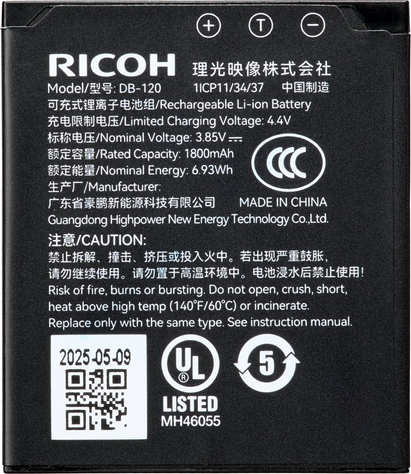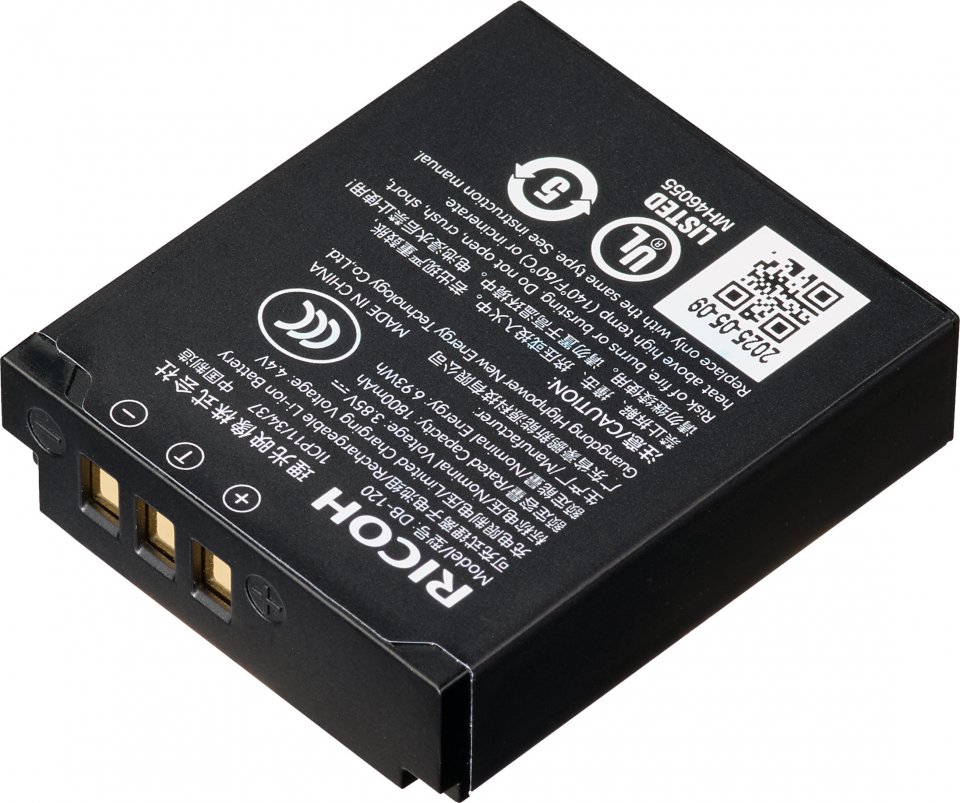 Ricoh DB-120 1800mAh litiumioniakku on tehty GR IV -kameralle. Täydellä latauksella se mahdollistaa jopa 250 still-kuvan ottamisen tai noin 240 minuutin toiston ennen uudelleenlatausta.
