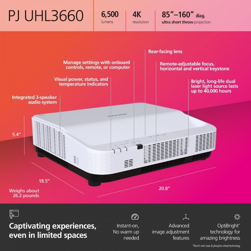 RICOH PJ UHL3660 on erittäin mukautuva 6 500 lumenin, 4K-laadun UST-laserprojektori. Suunniteltu haastaviin käyttökohteisiin, se tarjoaa 0,24 heittosuhteen, luoden 85 tuuman kuvan vain 46 cm etäisyydeltä. Langattoman yhteyden ansiosta se on helppo hallita, ja se toimii jatkuvasti jopa 45 asteen lämpötiloissa. Projektorissa on turvallisuustoimintoja julkisiin tiloihin. Taloudellinen ja tehokas projektori tarjoaa 40 000 tunnin käyttöiän, eikä suodattimia tai lamppuja tarvitse vaihtaa.