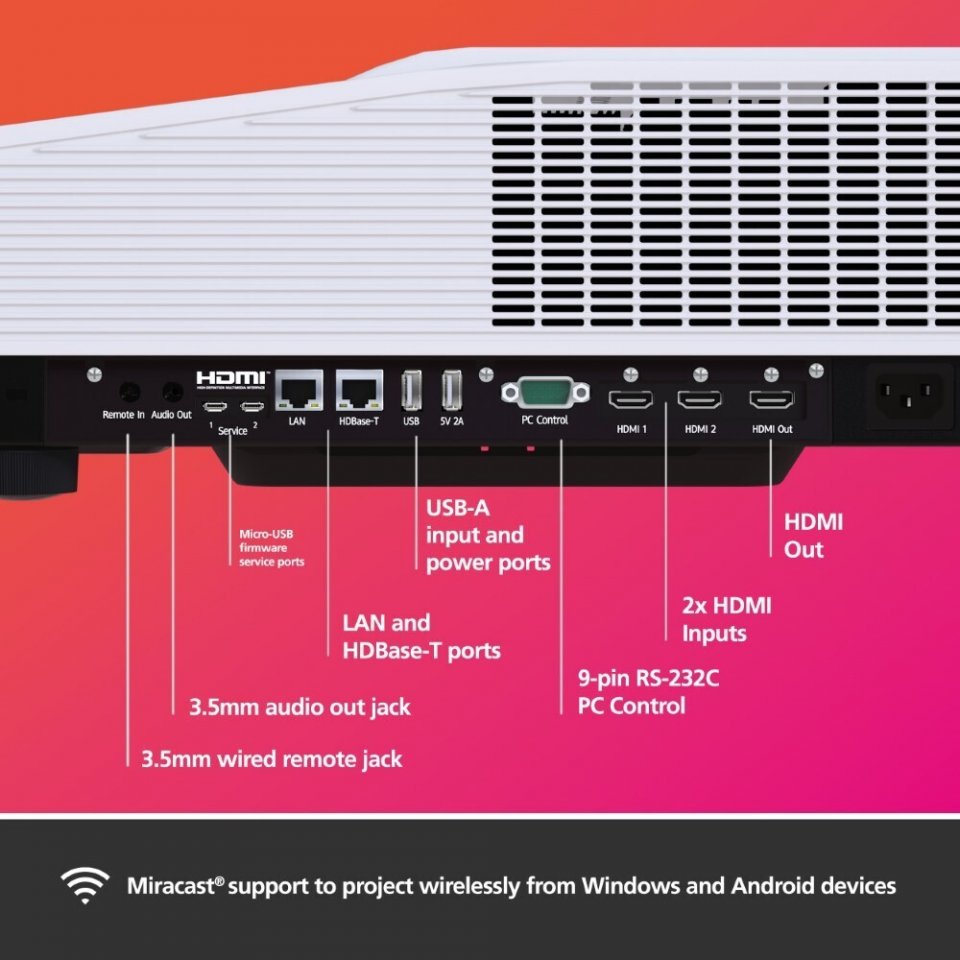 • 1 x VGA (D-Sub), 3 x HDMI 2.0, 1 x RS-232C, 1 x HDBaseT, 2 x USB 2.0, 2 x Micro USB, 1 x kuulokelähtö, 1 x Ethernet LAN (RJ-45)